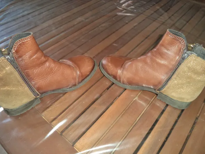 bottines plates femme ou fille taille 35 mais peu convenir à un petit 36 type cuir marron devant et daim pailleté derrière fermetures éclair bon état quelques traces d'usure mais reste en très bon état pour une deuxième vie (voir photos)