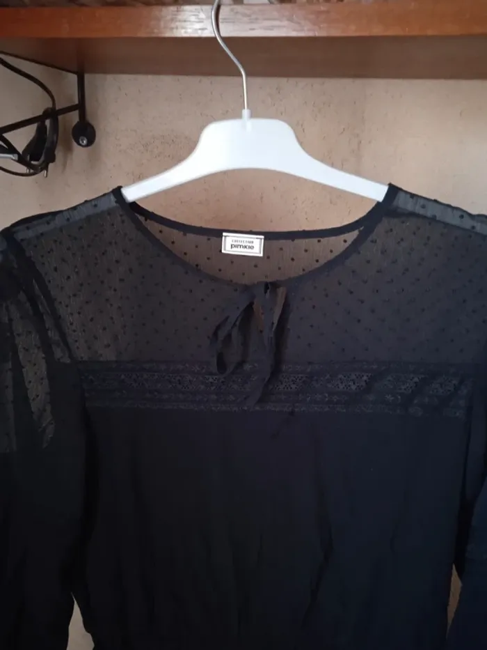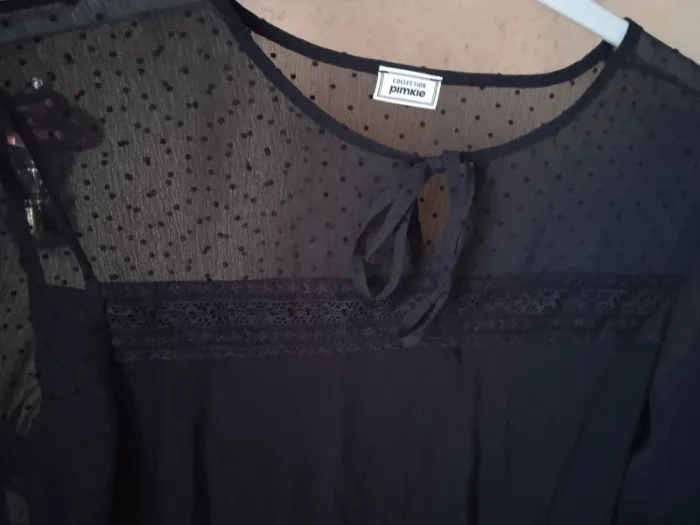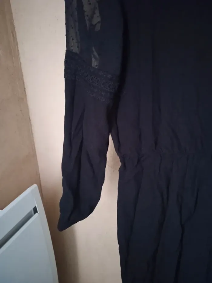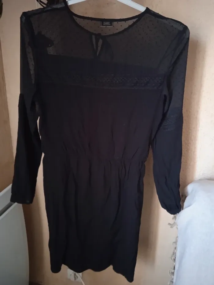 petite robe noire manches longues avec dentelle haut légèrement transparent à pois taille marquée par un élastique taille 36-38 S/M longueur genoux retro vintage Gothic soirée fête chic Marque PIMKIE femme fille ado portée mais reste en très bon état