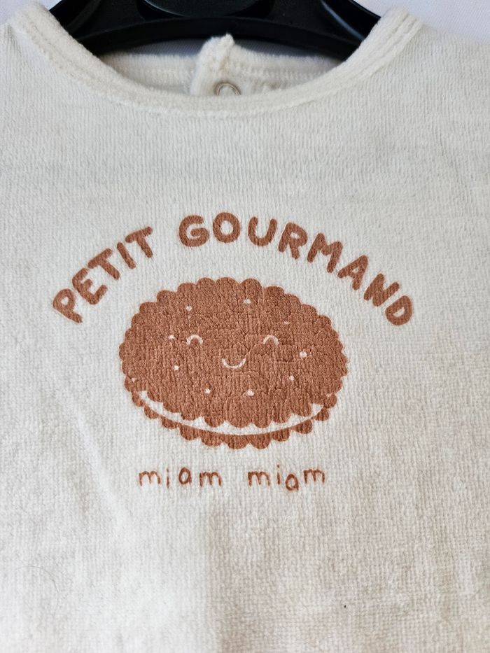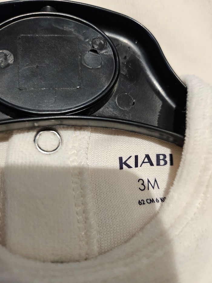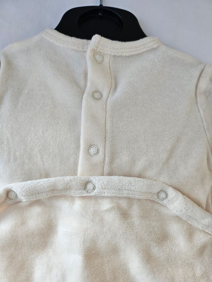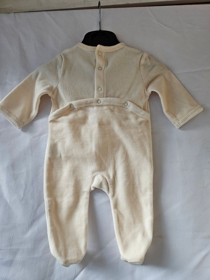 Pyjama en velours crème avec flocage devant. Ouverture par pressions dans le dos. Jamais porté, juste lavé. Marque : Kiabi Taille: 3 mois