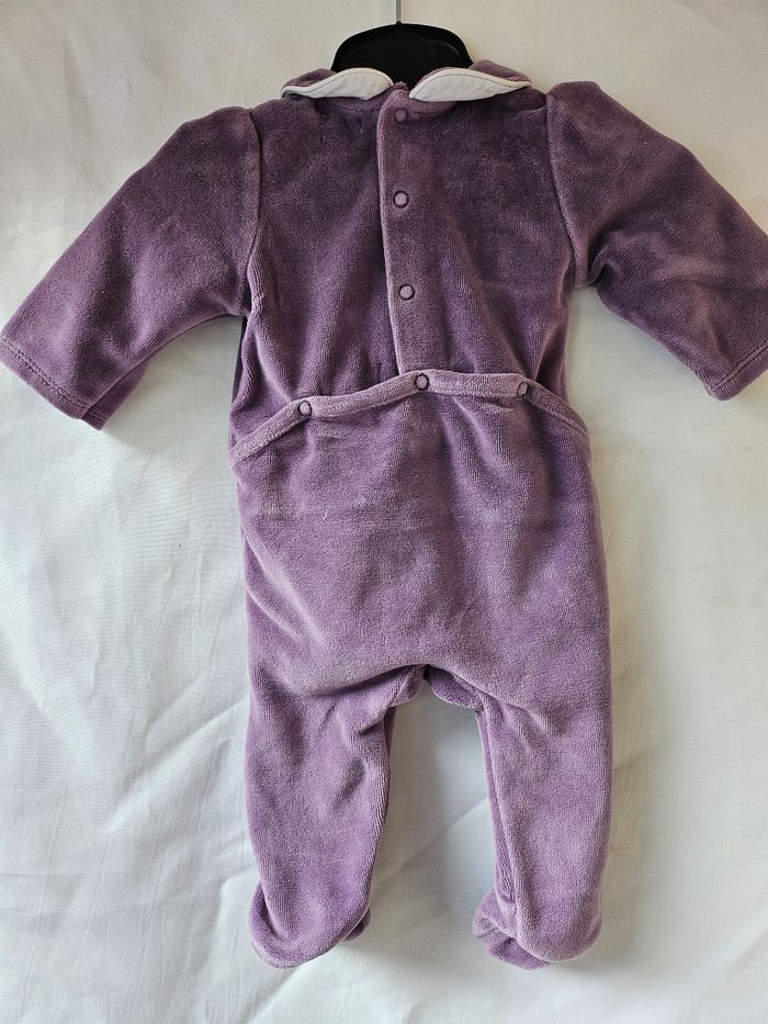 Pyjama en velours violet avec flocage ours devant. Col violet blanc en dessous. Ouverture par pressions dans le dos. Marque : Obaibi Taille : 3 mois