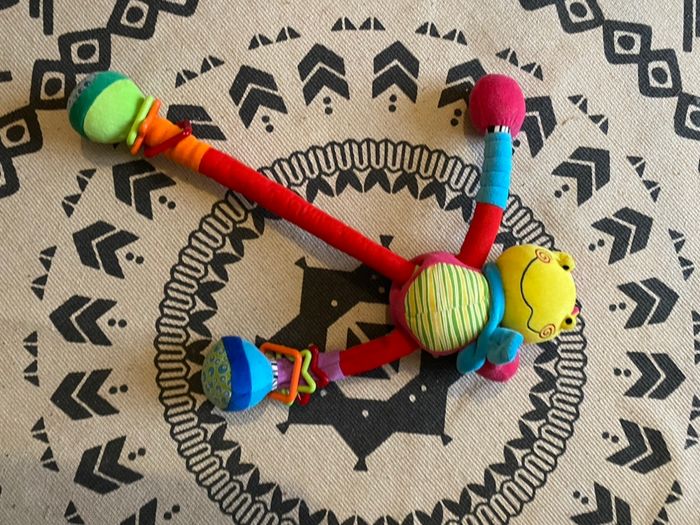 DOUDOU BEBE CONFORT HIPPOPOTAME VACHE COLORIS ROSE JAUNE ROUGE VERT BLEU ORANGE MAUVE Différentes matières de tissus et formes géométriques en étoile et en carré de couleurs vives Ses bras et ses jambes coulissent de haut en bas Hauteur +/- 34/ 36 cm ( en mettant les bras et les jambes de même grandeur ) Hippopotame rose avec clochettes Grenouille verte