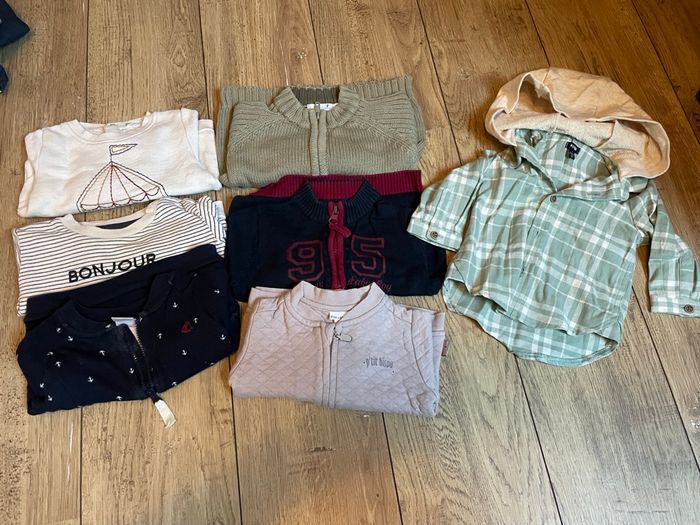 Lot de 2 pulls + 4 gilets + 1 chemise à capuche, en très bon état. Taille : 6 mois Marques : petit bateau, bout’chou, orchestra, p’tit bisou, in extenso, kiabi