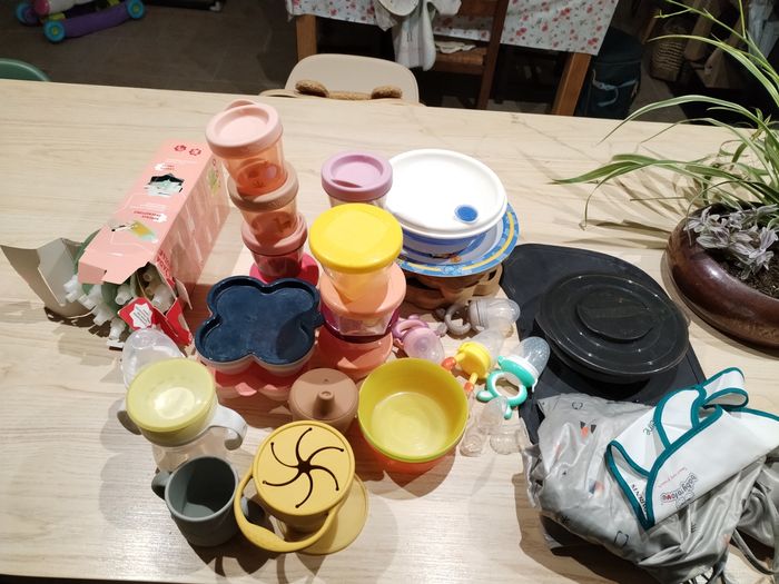 Ensemble de vaisselles et ustensiles pour la diversification alimentaire de bébé et la suite - 4 grignoteuses avec 4 tétines de rechanges (2 grandes et 2 petites tailles) _ 11 pots de conservation marques Alvar et Babymoov + 2 pots en silicones compartimentés Verbaudet - 1 bavoir plastique + 1 bavoir a manche imitation des bavoir de marque Tidy tot - 6 assiettes plastique diverses marques dont 1 ensemble vaisselle Twistshake noir - 4 bols plastiques - 2 tasses a bec + 1 tasse anti fuite + 1 mug en silicone - +20 gourdes réutilisables marque Badabulle Tout en très bon état