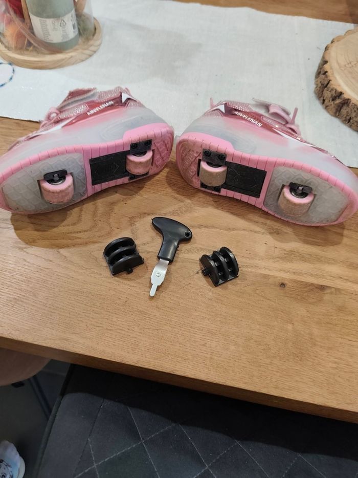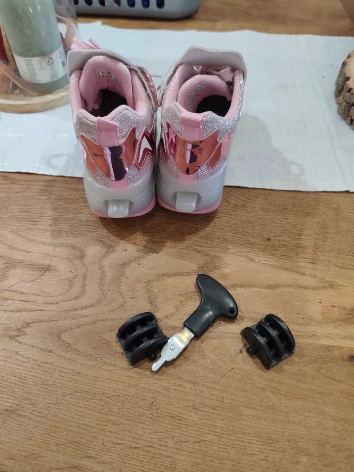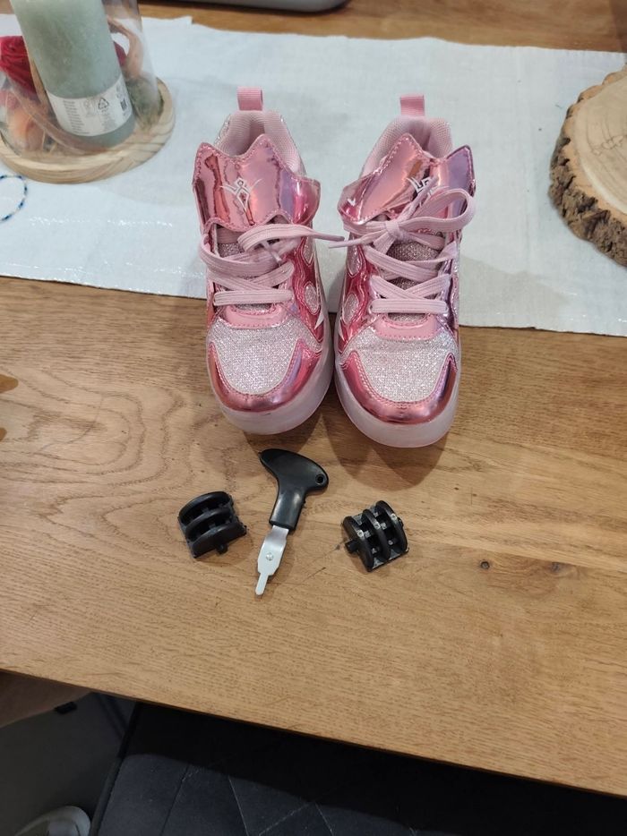 baskets pour fille pointure 30, couleur rose avec paillettes. Modèle avec roulettes amovibles (possibilité de marcher normalement ou de rouler). 👉 Vendues avec : roulettes clips outil de montage ⚠️ À noter : les lumières LED ne fonctionnent plus. Cela n’empêche pas l’utilisation normale des chaussures. Bon état général (voir photos).