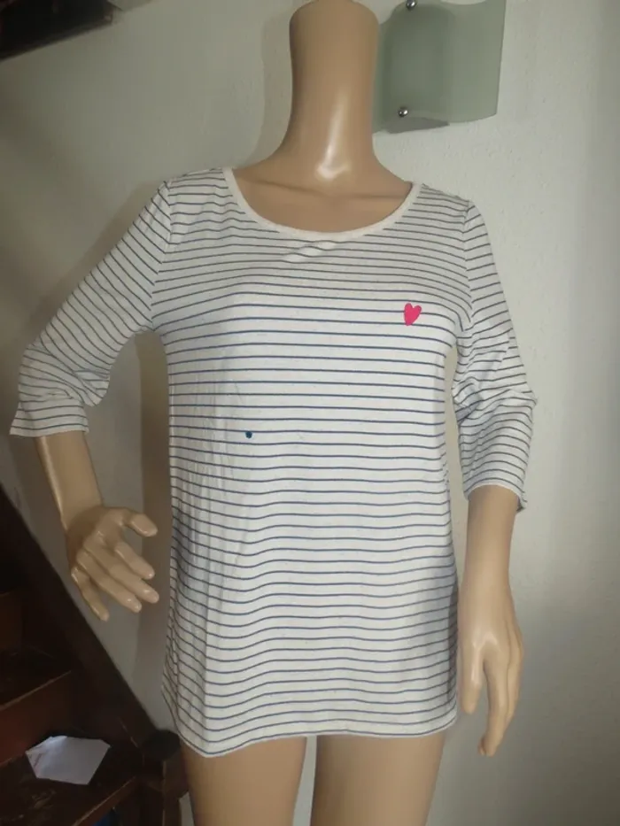 Je vends ce t-shirt femme à rayures fines, parfait pour un look casual et intemporel au quotidien. - Type de produit : T-shirt - Univers : Femme - Taille : S (36) - Couleur : Crème / Blanc cassé avec rayures bleu marine - Caractéristiques : Manches 3/4, Motif rayé, Détails cœur brodé N'hésitez pas à me contacter pour plus d'informations ou de photos.