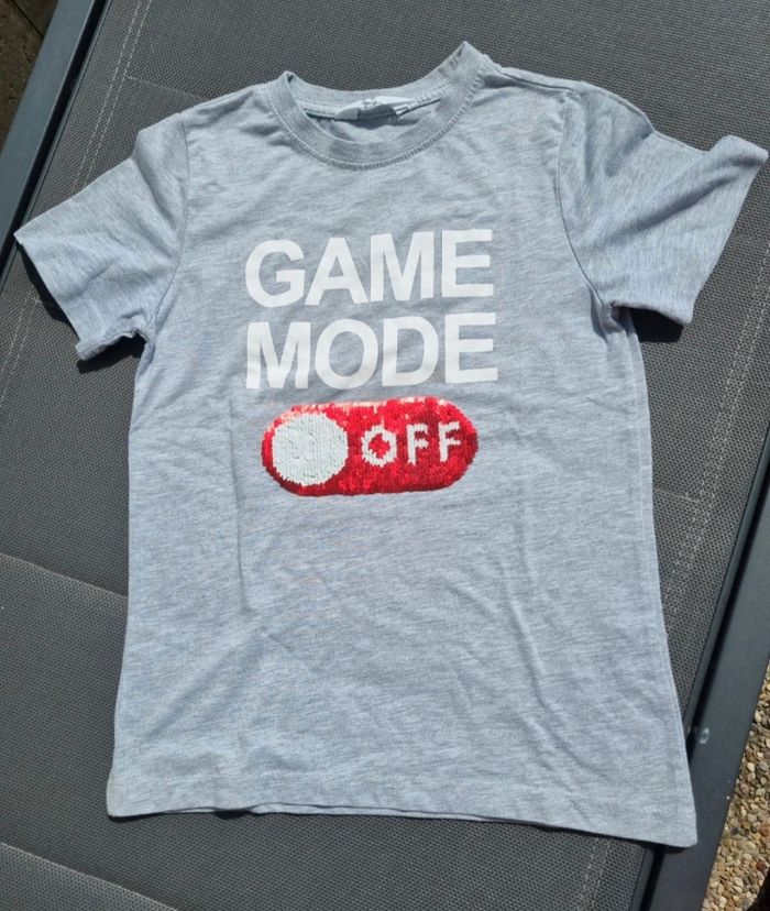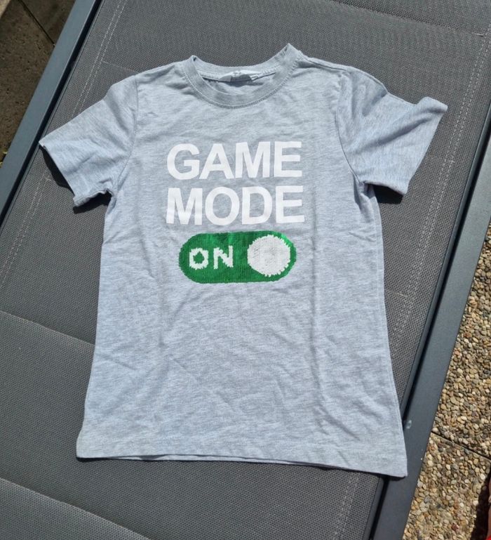 T-shirt gris original à sequins réversibles, côté ON vert et côté OFF rouge. Taille 8-10 ans Très bon état