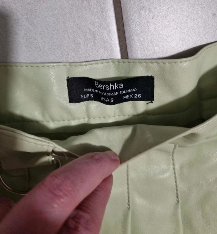 Mini jupe en simili cuir vert pistache 💚 Couleur originale et très tendance, parfaite pour un look stylé et moderne Taille 34 (mesures à plat : 34 cm) Longueur : 39 cm Coupe plissée, facile à porter Matière simili cuir souple et agréable Se porte aussi bien avec un pull oversize en hiver qu’avec un top en été ☀️ Très bon état