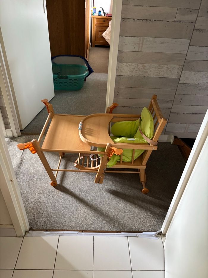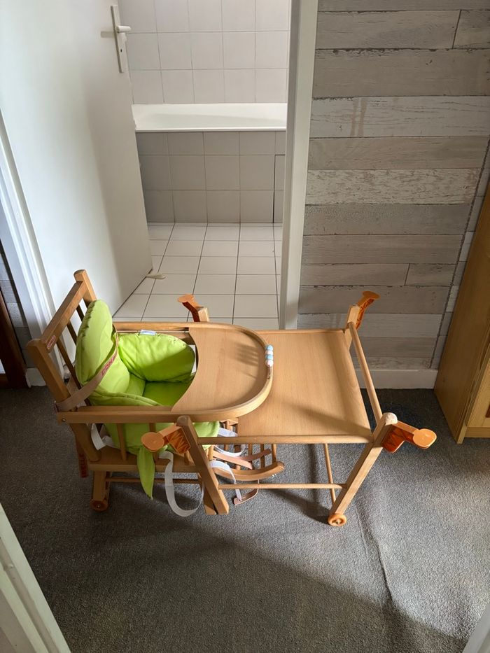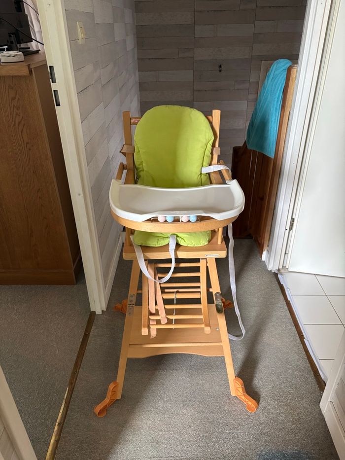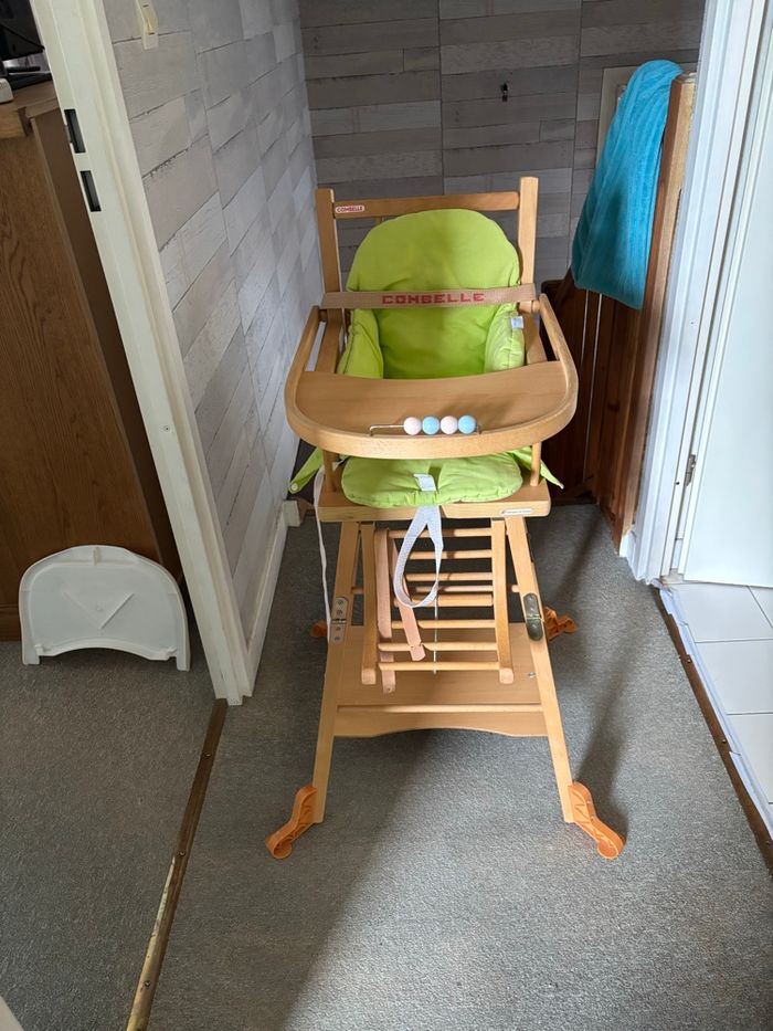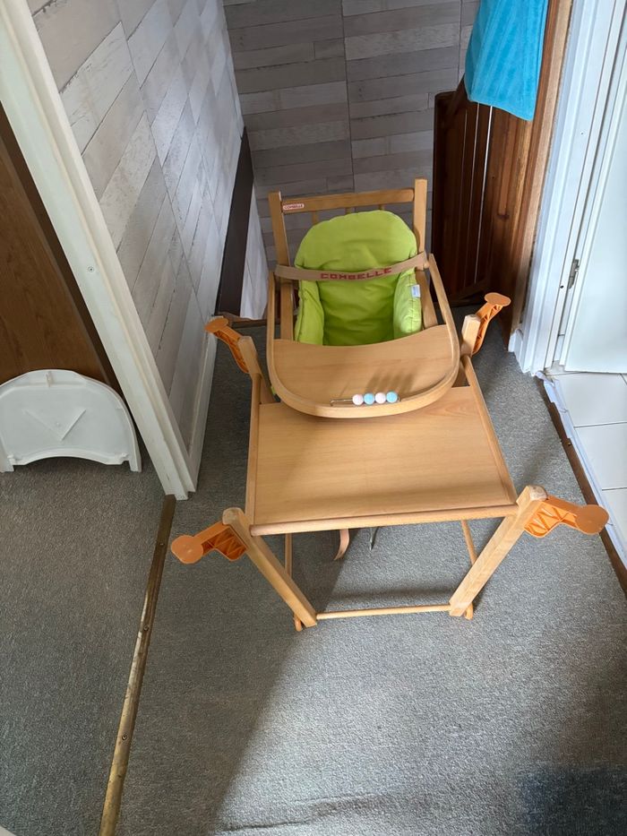 Chaise haute en bois marque combelle avec coussin et plateau