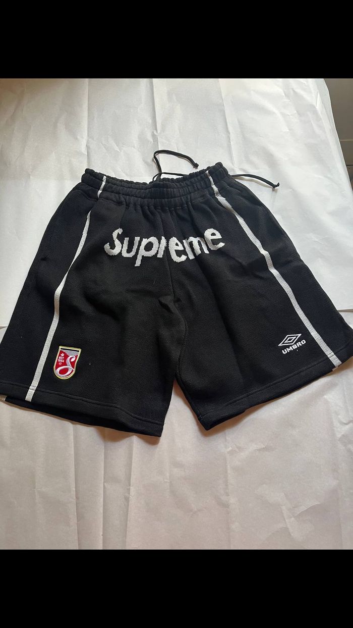 Short Supreme x Umbro – Soccer Short Taille : M Coloris : Noir / Blanc Logo Supreme brodé frontal Logo Umbro brodé jambe droite Écusson Supreme x Umbro jambe gauche Bandes latérales blanches Taille élastique cordon noir Matière mesh football Coupe football / streetwear 🔥 État : Très bon état