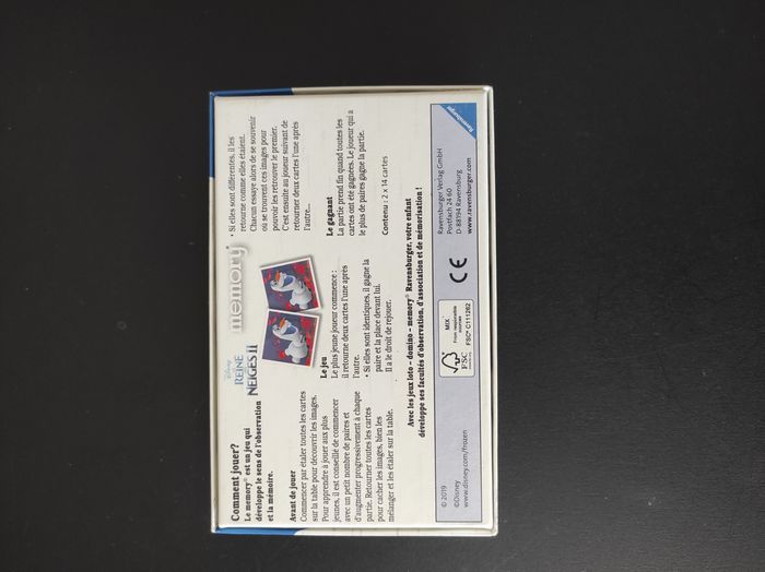 "Jeu Memory sur le thème de La Reine des Neiges (Frozen) – parfait pour les fans d’Elsa, Anna et Olaf ! Toutes les cartes sont complètes et en excellent état, utilisées très peu de fois. Boîte également en très bon état, sans déchirure ni marque. Détails : Marque : Ravensburger Contient : 2X14 cartes Âge recommandé : à partir de 4 ans"