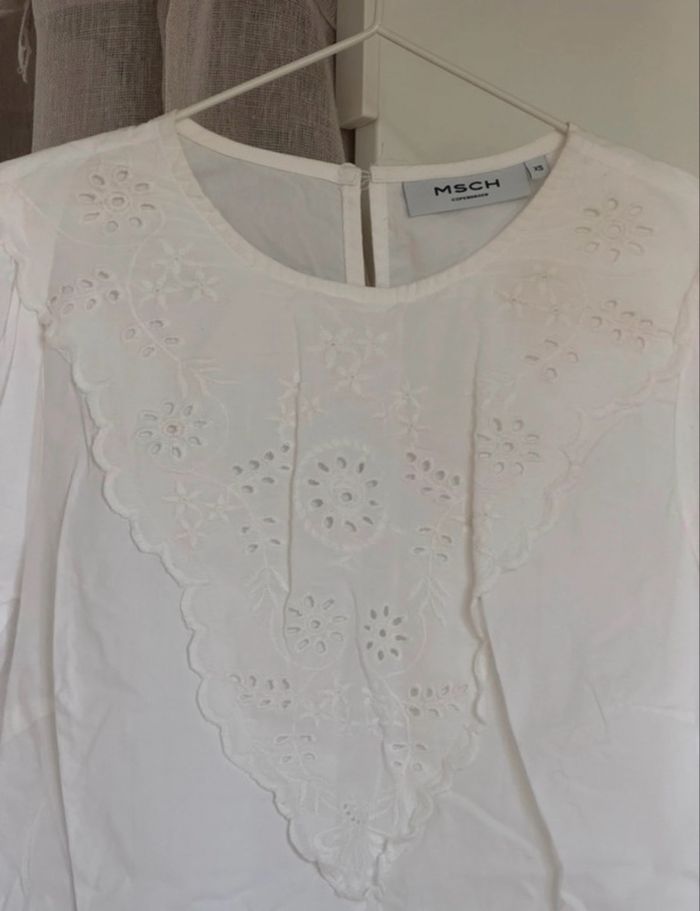 Très jolie blouse blanche avec de la broderie de la marque MSCH Copenhagen en taille XS Porté plusieurs fois mais toujours en très bon état