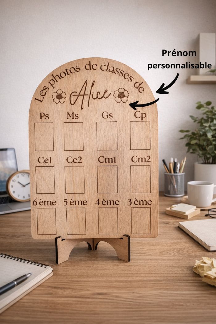 Cadre en bois pour photos scolaires 📸 De la maternelle au collège (PS à 3ème). ✔️ Personnalisable avec le prénom de l’enfant ✔️ Gravure propre et durable ✔️ Support inclus ✔️ Idéal souvenir / cadeau 👉 Merci de m’indiquer le prénom en message après achat (ou me contacter avant pour validation)