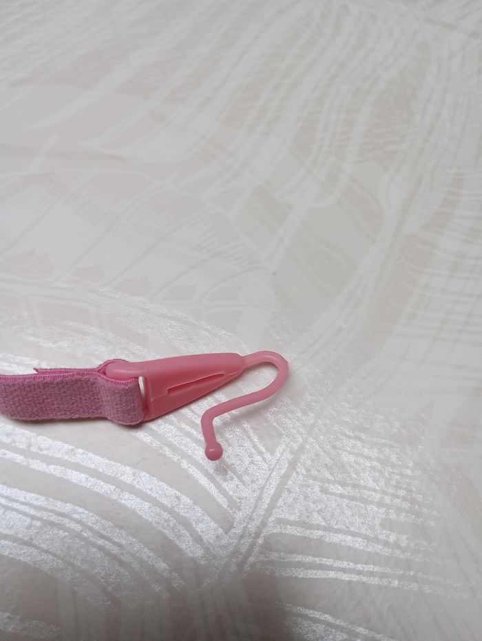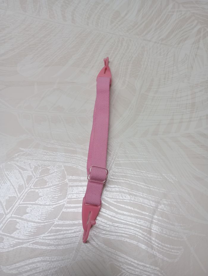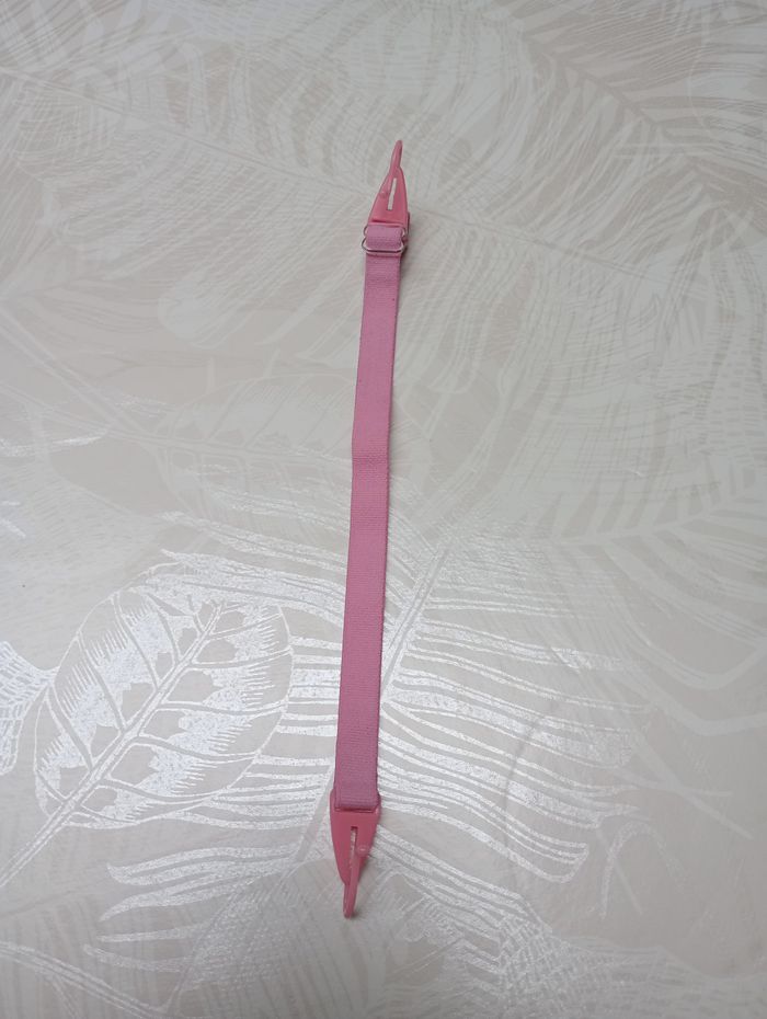 Attache pour lunettes avec crochets. Réglable et élastique. Minimum : 15,5 cm. Maximum : 24 cm. Couleur : rose. Neuf
