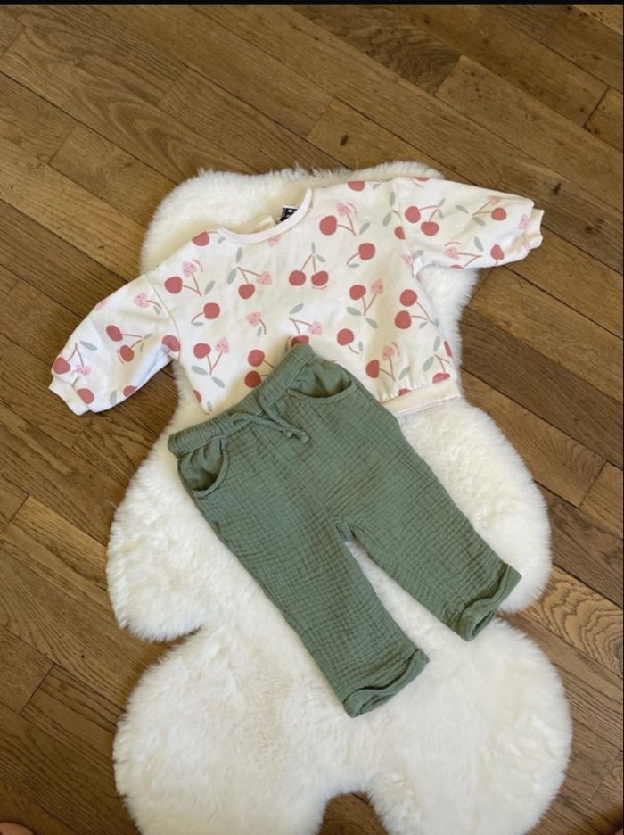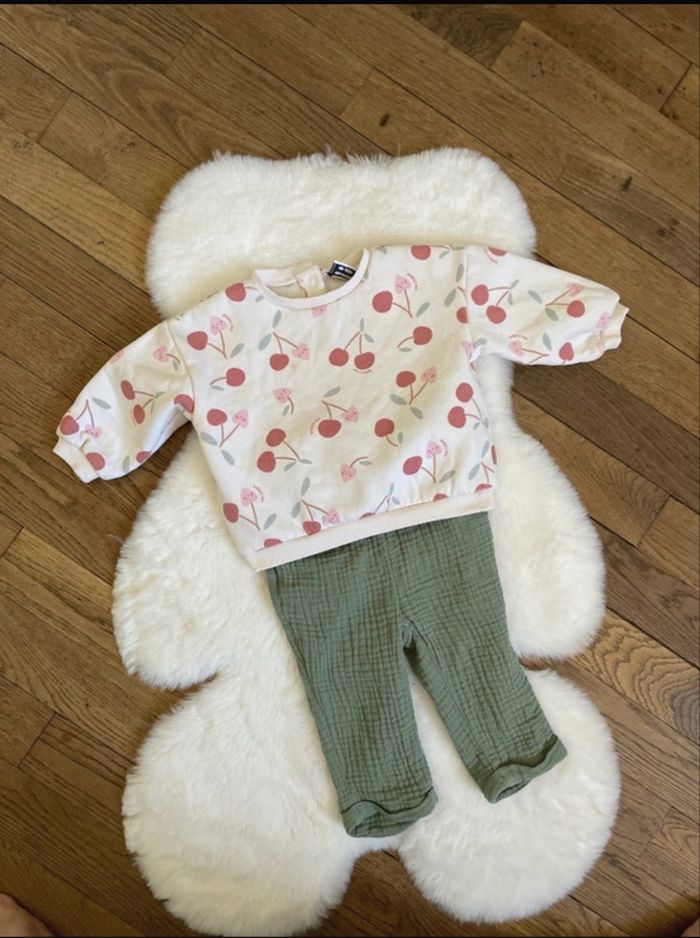 Jolie ensemble avec pull blanc avec motif cerise et un pantalon léger kaki Taille 6 mois