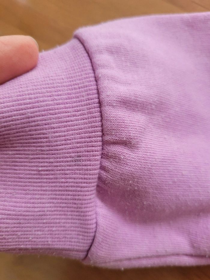Pull rose/violet licorne 6 ans Avec des paillettes et des strass Très bon état général avec des petites traces d'usage (une petite tâche à un poignet et des très légères traces sur les manches qui se voient à peine, il faut vraiment regarder de près)