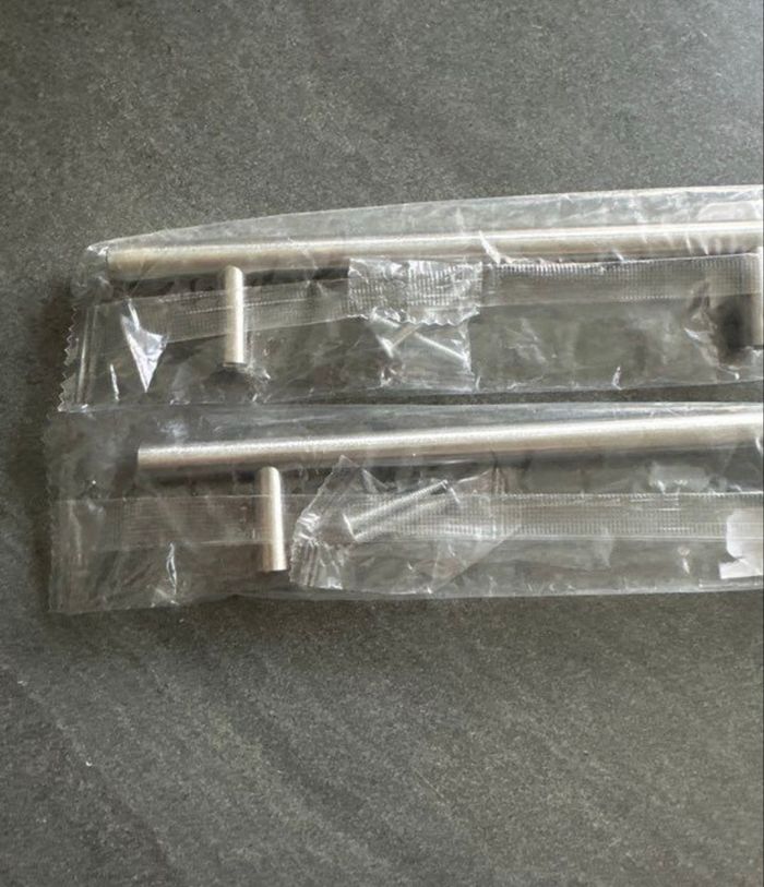 Lot de 2 poignées de meuble en inox Longueur : 18,8cm Longueur entre les deux fixations : 12,8cm Vis inclus Jamais servie car trop grande, neuve