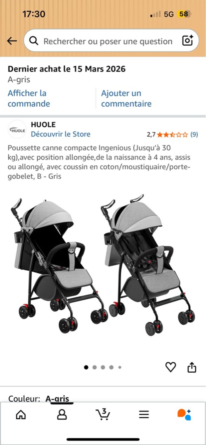 Je vends cette poussette canne de couleur argentée/acier, neuve sans étiquette. - Type de produit : Poussette canne - Couleur : Argenté / Acier - État : Neuf sans étiquette elle a très peux servi je les achète il y a 2 mois sur amazone j’en est 2 car j’ai des jumeaux prix à l’unité N'hésitez pas à me contacter pour plus d'informations ou de photos.