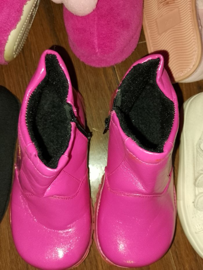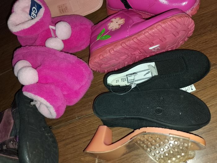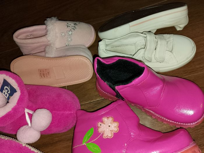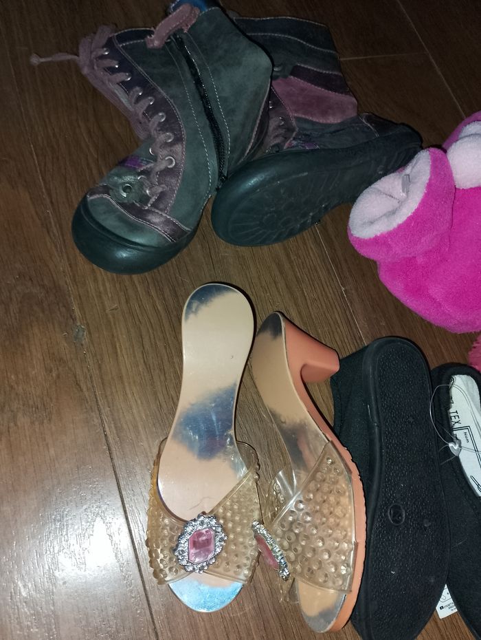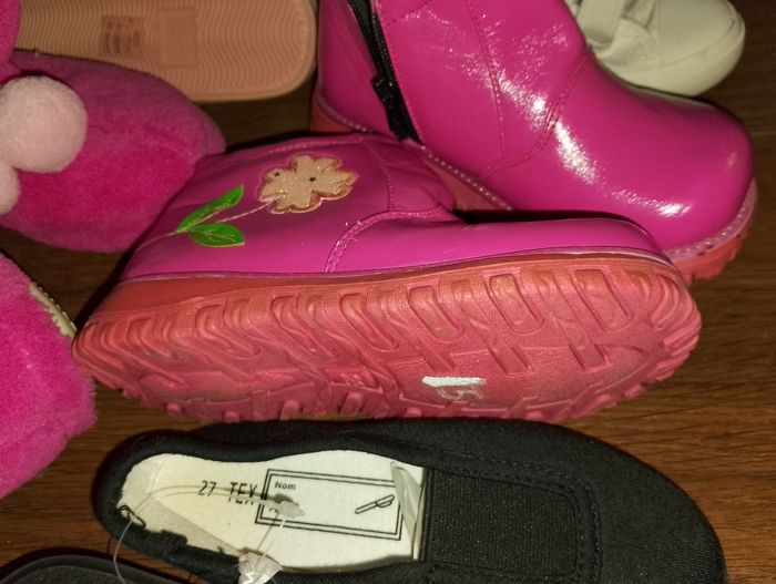 Divers chaussures p.27 ## différents prix ## Pointure 27 Botte multicolores 12€ 2 paires de Pantoufles neuve Gemo 12€ pièce Chaussure de princesse 8€ Ballerine noir neuve Tex 12€ Bottine rose intérieur fourré avec fermeture éclair (27/28) 18€ Chaussure blanche plate en toile Primark a scratch 12€