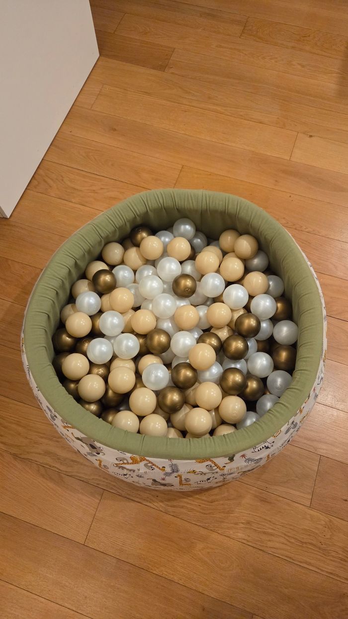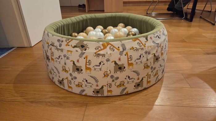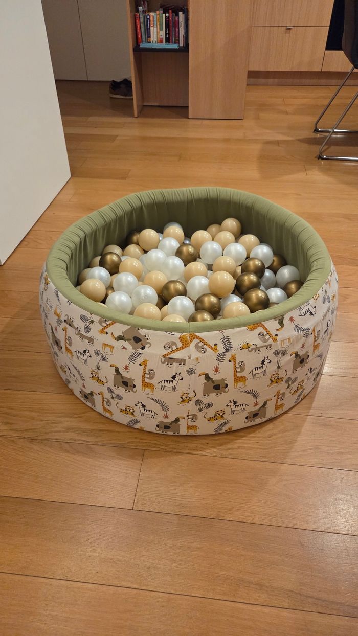 Piscine à balles de la marque Ma Petite Chaise, thème savane. En parfait état, presque jamais utilisée. Achetée 70€ neuf. Diamètre 80cm. Entièrement déhoussable et lavable en machine. A récupérer sur Toulouse