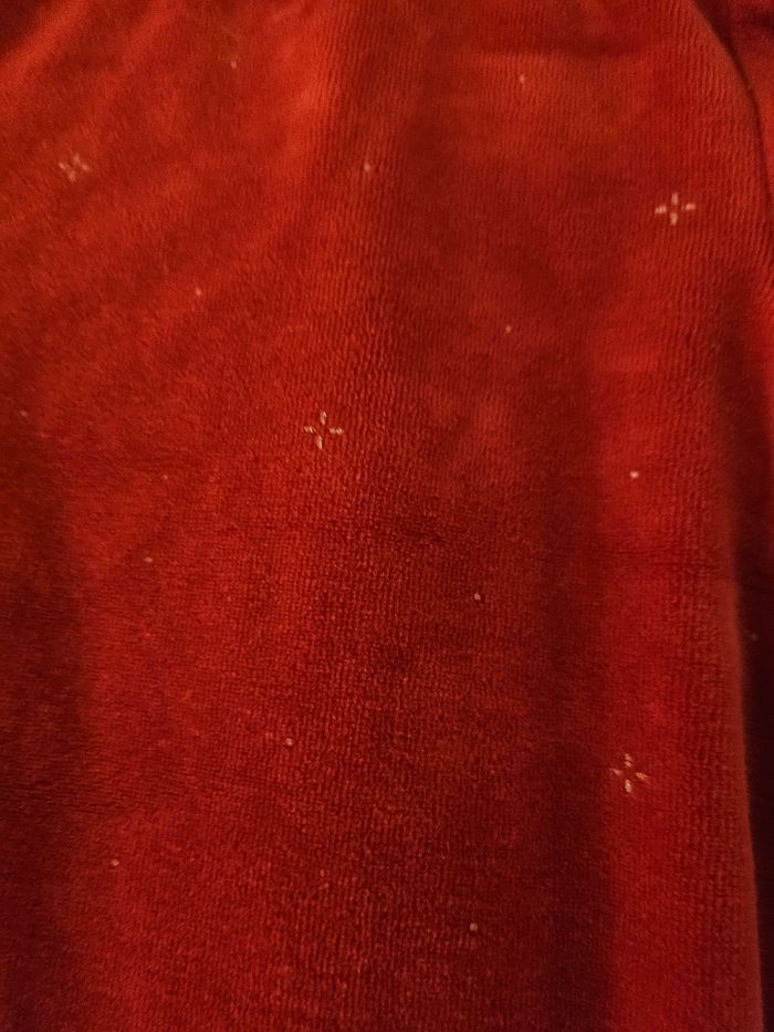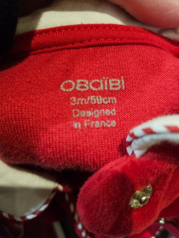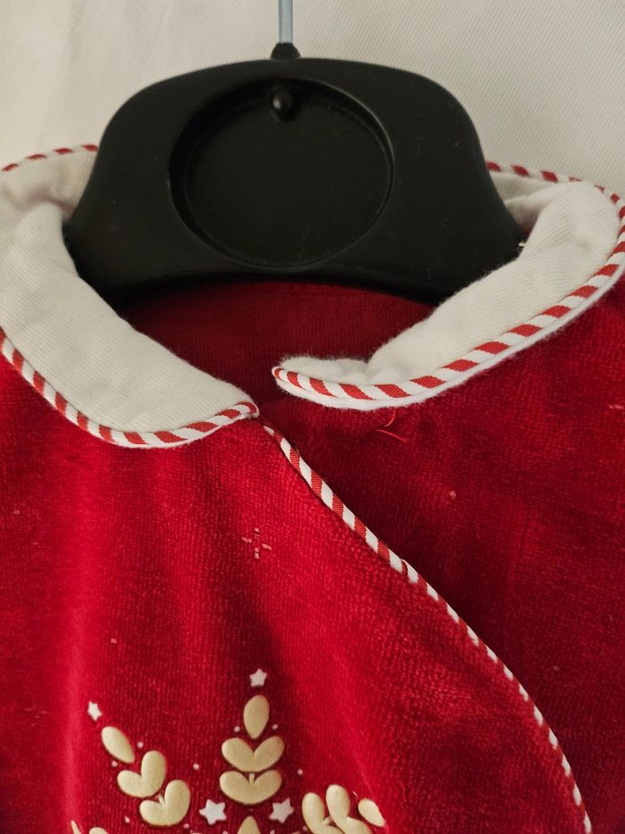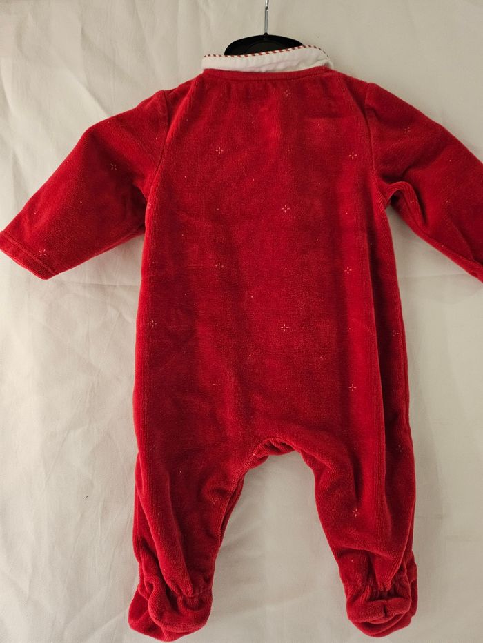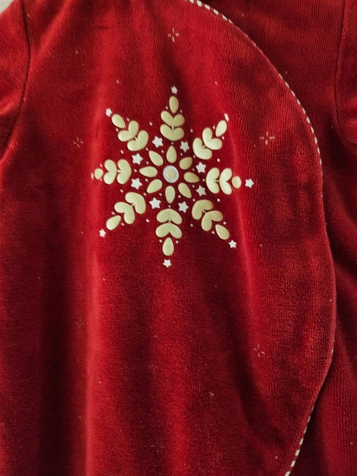 Pyjama en velours rouges. Flocage flocon doré devant. Col blanc et rouge. Ouverture par pressions sur le devant. Marque : Obaibi Taille: 3 mois