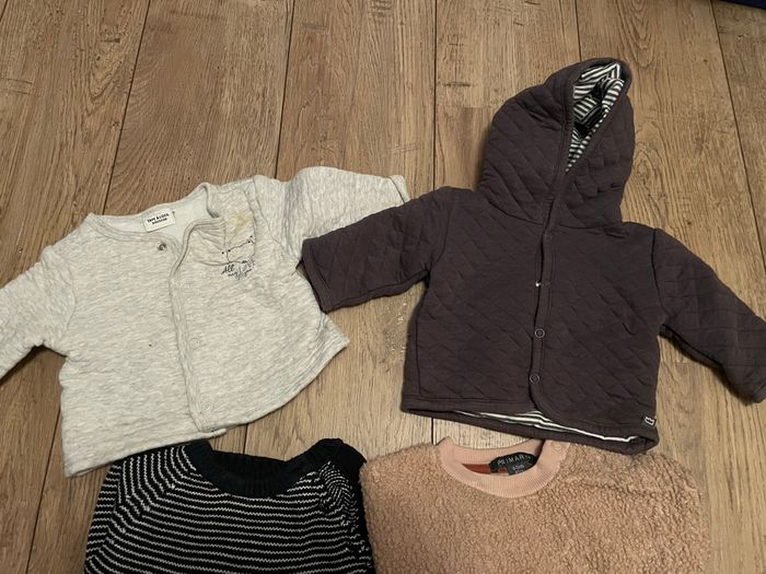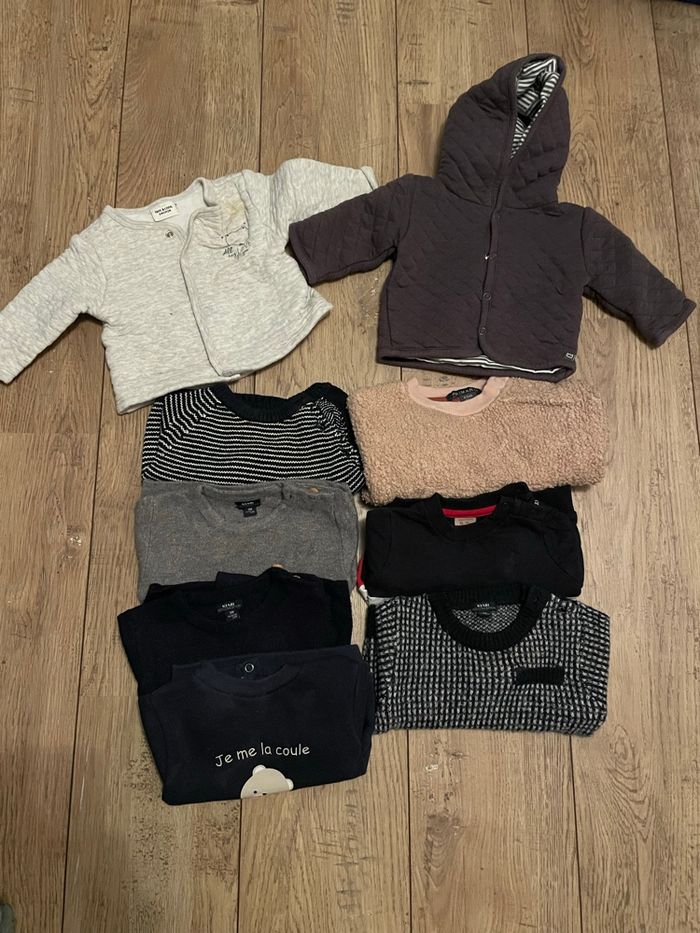 Lot de 6 pulls et 2 gilets, en très bon état. Taille : 3 mois Marques : Kiabi, primark, TAO, mes petits cailloux