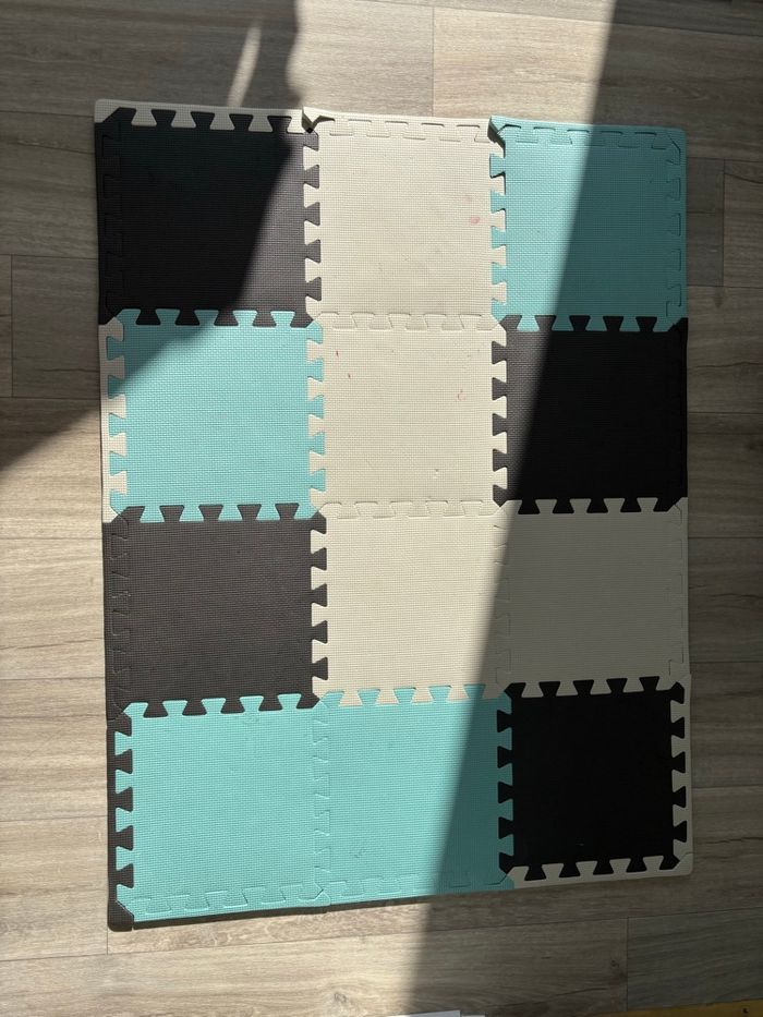 Comme neuf J’ai acheté 40€ Tres épaisse et costaud 120 x 90 cm et une épaisseur de 1,2 cm . Idéale pour bébés à partir de 0 âge, enfants et adultes. Forme carré, Composé de 12 pièces carrées d’environ 30 x 30 cm et 14 pièces supplémentaires pour faire la bordure. Cela fait du tapis de puzzle un excellent jouet pendant de nombreuses années ! Pourquoi choisir un tapis sous forme de puzzle en mousse : Il est sans limite d’âge, dès les premiers jours de la vie ! Fabriqué en mousse EVA d’origine de la plus haute qualité Très grande taille une fois plié Confortable – environ 1,2 cm d’épaisseur ! Le tapis est facile à nettoyer. N’absorbe pas les liquides renversés. Il suffit d’essuyer la surface du tapis avec un chiffon humide pour réussir à éliminer toute saleté. Il est Imperméable et a une structure antidérapante Il isole du sol froid et absorbe les chocs en cas de chute Convient partout, parfait pour une chambre d’enfant, un salon, un balcon ou même un jardin. Sécurité – Le tapis EVA est inodore Il peut être utilisé par les personnes allergiques Il est Antibactérien 100% sûr, il ne contient pas d’ingrédients indésirables, par exemple le formamide La sécurité est garantie par le certificat européen CE et les tests E
