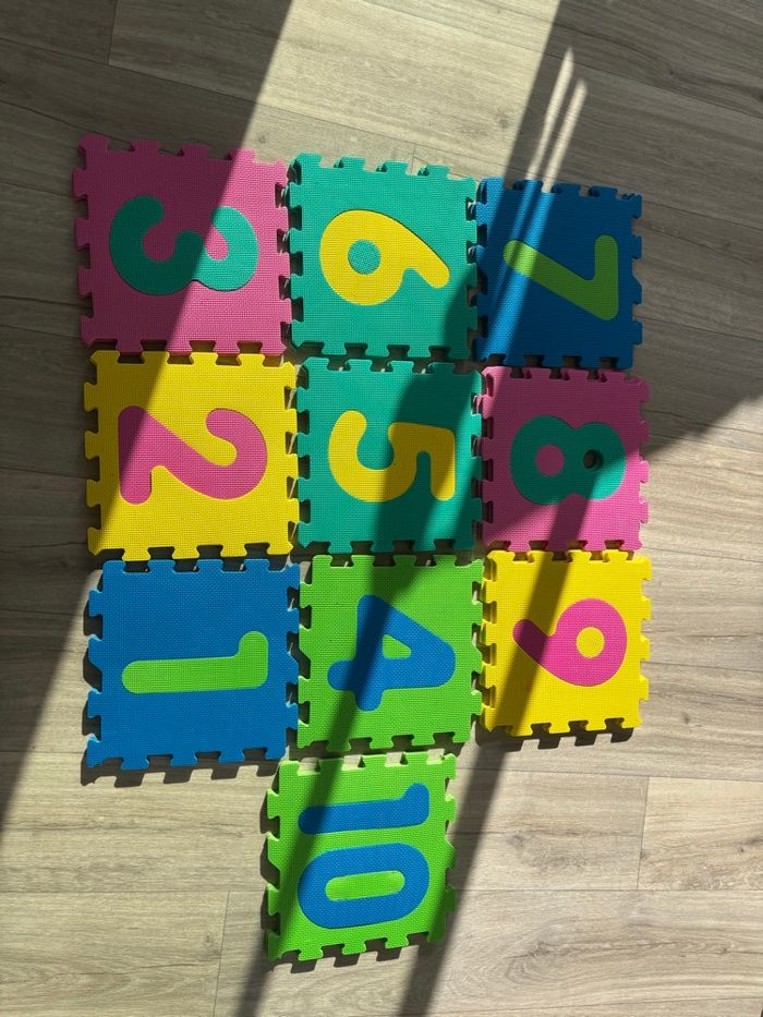 Vends tapis de jeu en mousse pour enfants, composé de 10 dalles avec chiffres de 1 à 10 Etat comme neuf J’en ai 2 Prix pour 1 10€ et 18€ pour les deux Tapis coloré, ludique et éducatif, idéal pour apprendre les chiffres tout en jouant. ✔️ Mousse épaisse et confortable ✔️ Dalles emboîtables, modulables selon l’espace ✔️ Parfait pour chambre d’enfant, salle de jeux ou assistante maternelle ✔️ Protège du sol froid et amortit les chutes