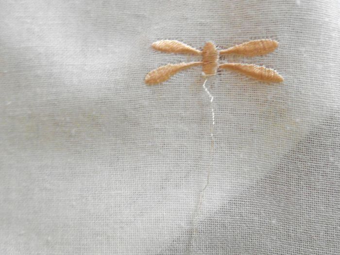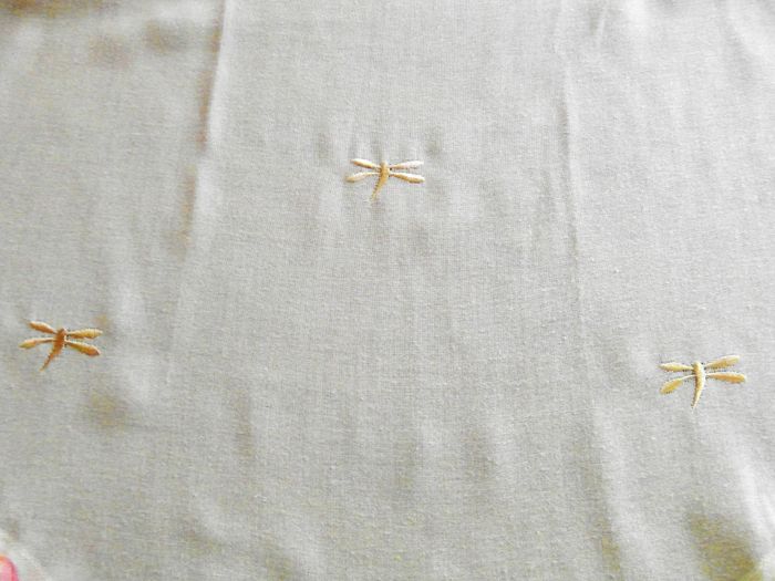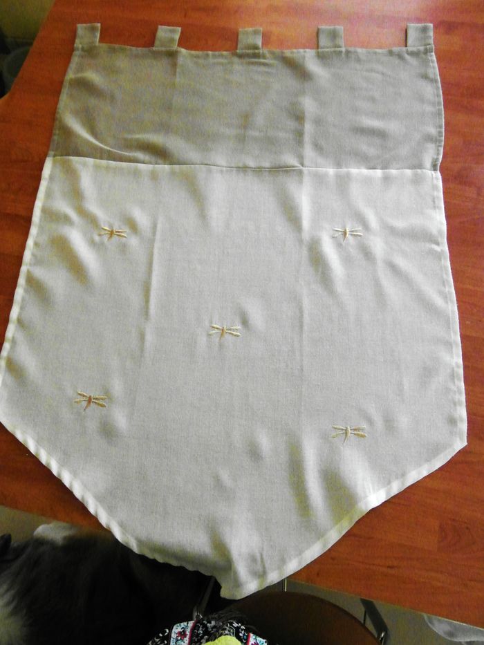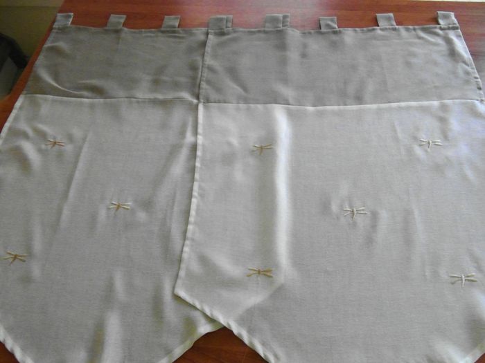 rideaux en pointe avec pattes pour la tringle 2 couleurs (beige/écru) avec insectes brodés bon état (1 broderie se défait sur un rideau : voir photo) largeur 60 cm - longueur 84 cm à la pointe - longueur 64 cm sur les côtés.