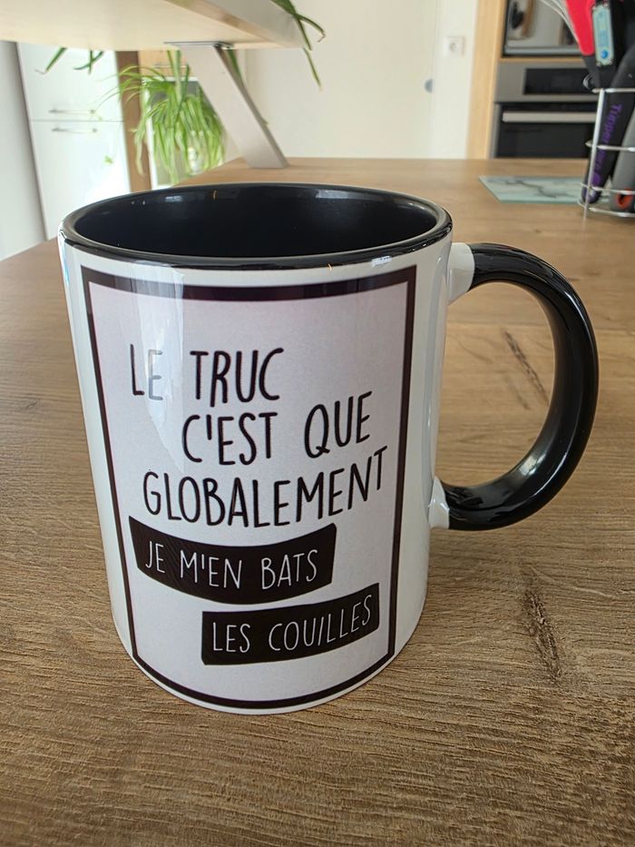 Je vends ce mug humour en céramique avec un message drôle et décalé. Parfait pour les amateurs de café ou de thé avec une touche d'humour au quotidien! - Type de produit : Mug - Matière : Céramique - Couleur : Blanc avec intérieur noir - Motif : Texte humour « Le truc c'est que globalement je m'en bats les couilles » - Anse : Noire - Contenance : Standard État neuf N'hésitez pas à me contacter pour plus d'informations ou de photos.