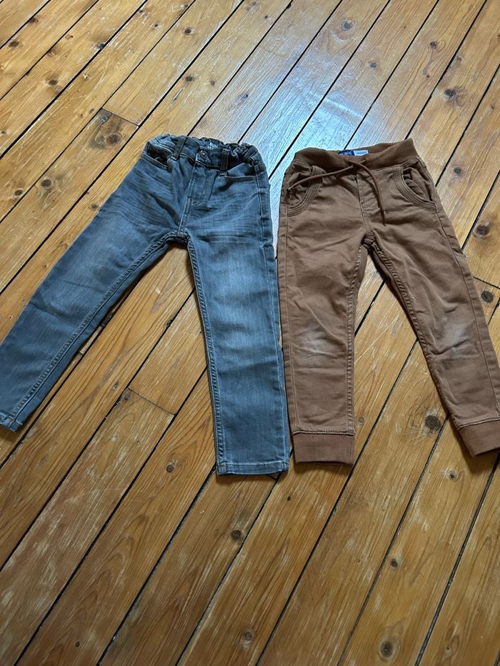 Le gris kiabi slim le marron Okaïdi jogger. Les genoux du marrons sont légèrement frotté , le gris pas de traces très bon état
