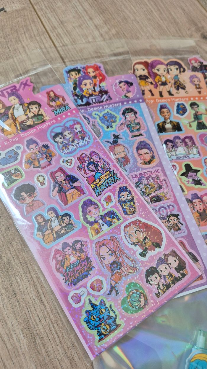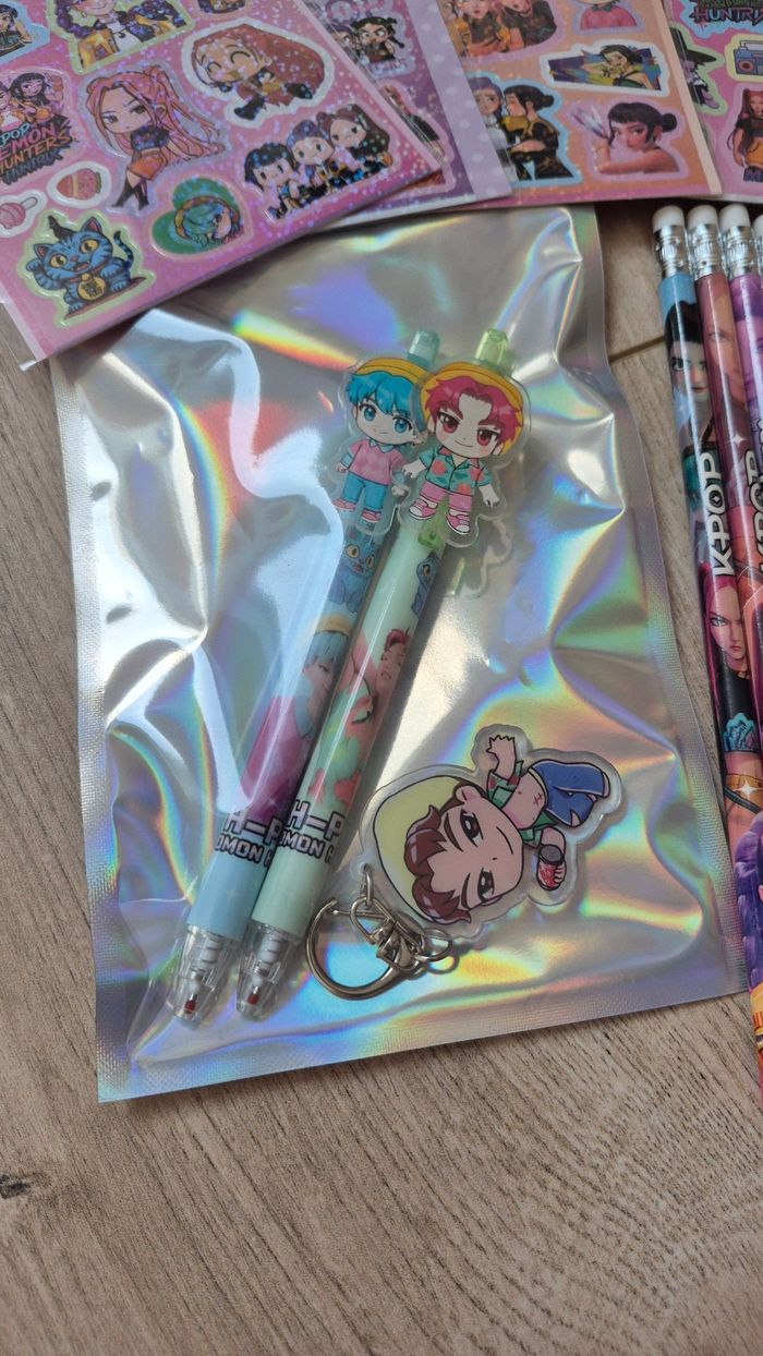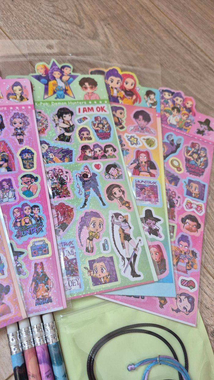 Lot K-pop demon hunters neuf : - 7 planches de stickers brillants - 2 stylos - 1 porte-clés - 4 crayons de bois - 1 collier - 1 bracelet