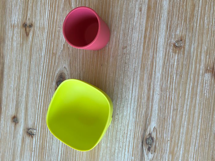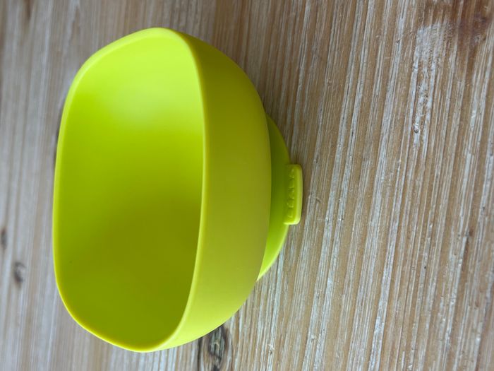 En très bon état. Ventouse intégrée sous le bol pour éviter les incidents 100% Silicone alimentaire haute qualité : matière douce, souple, silencieuse et sans risque pour l’enfant (sans BPA*, PVC ou phtalates) Vaisselle incassable Passe au micro-ondes et au lave vaisselle