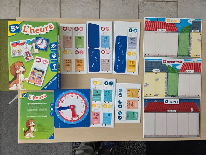 Bonjour Je vends ce jeubde société pour apprendre l'heure Marque ravensburger A partir de 5 ans Tres bon etat dans sa boite d'origine avec la notice N'hésitez pas à faire un lot dans mon dressing Cordialement