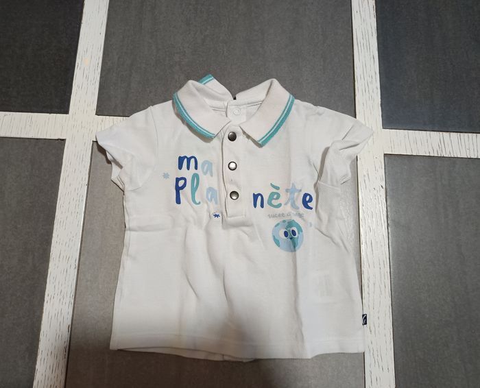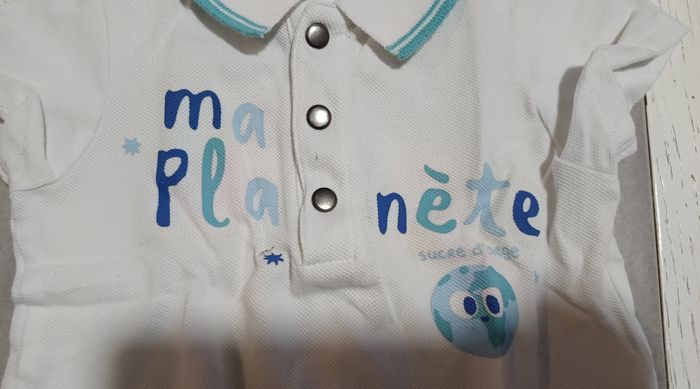 Joli ensemble Sucre d’Orge en taille 6 mois, composé de : - 1 polo blanc à manches courtes avec inscription “Ma planète” - 1 short réversible turquoise ou bleu Une tenue fraîche, confortable et parfaite pour l’été. Style chic-décontracté, idéal pour les sorties, les vacances ou le quotidien. Marque : Sucre d’Orge Taille : 6 mois État : Très bon état