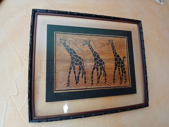 Tableau artisanal africain 3 girafes feuilles de.bananiers