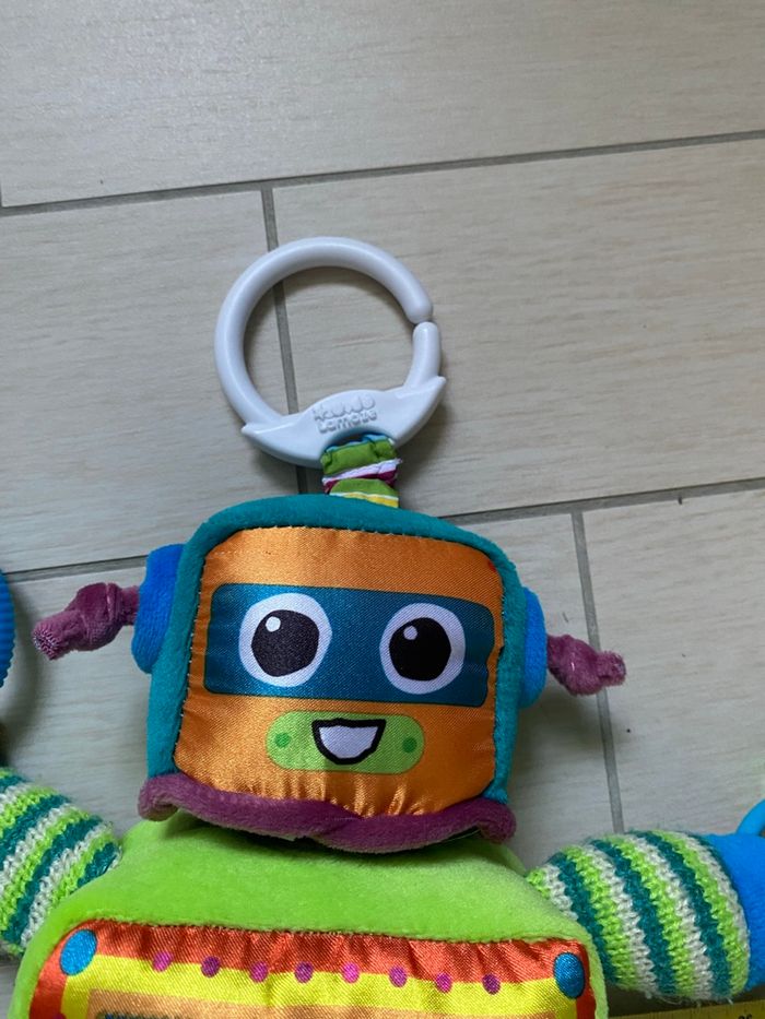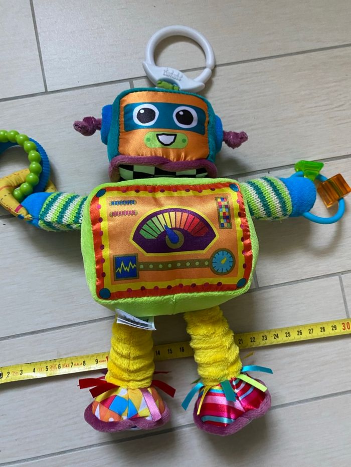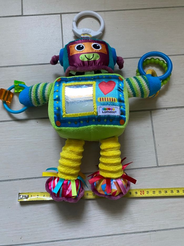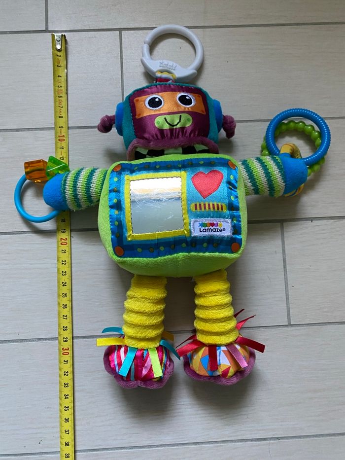 Jouet d’éveil Rusty le robot, peut s’accrocher (berceau, poussette, barreau de lit…) marque Lamaze. En très bon état.