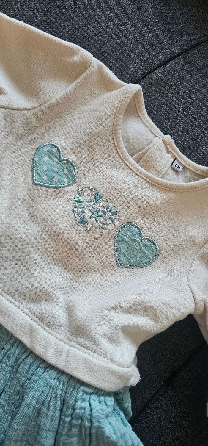 Robe d'hiver manche longue Taille 6mois Marque : plus collection Couleur bleu et blanche avec des coeurs Il a un bouton de rechange Porter 1 fois