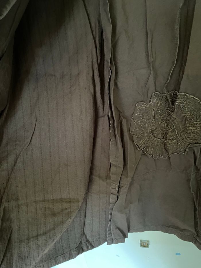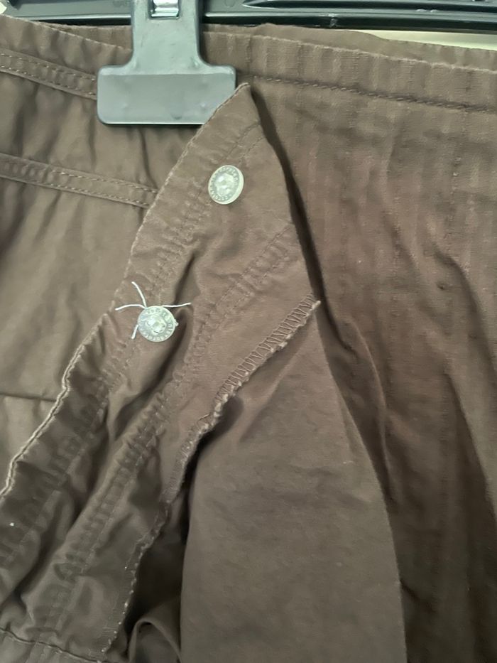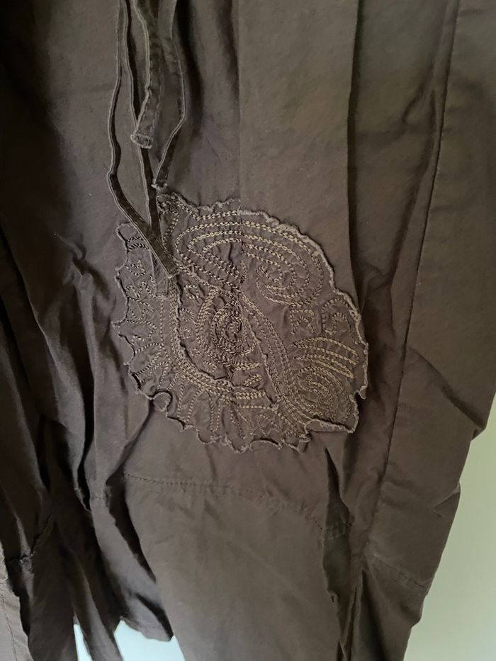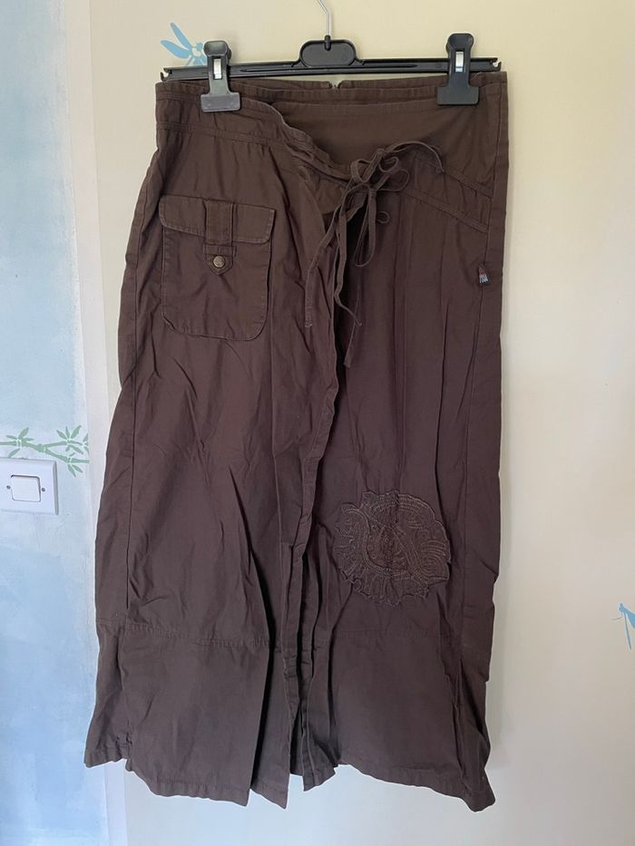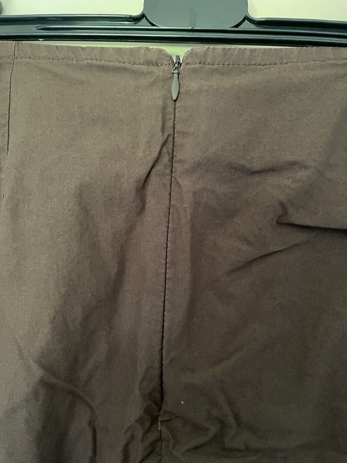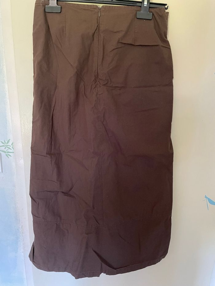 Jupe longue marron style porte feuille Style porte feuille sur le devant mais il y a une doublure Possibilité d ajuster car il y a 2 boutons et 2 liens Une vraie poche Une fermeture éclair invisible à l arrière Largeur taille :36 cm Longueur :83 cm Ni trou ni tache Très peu portée