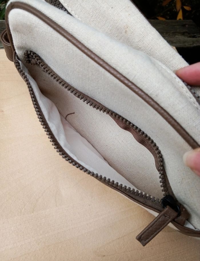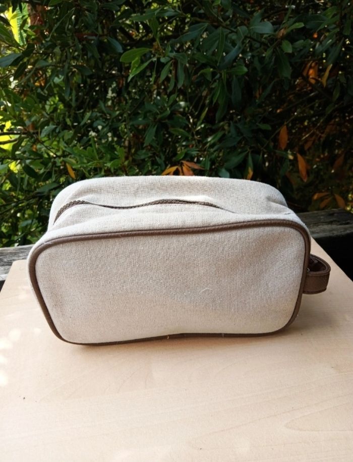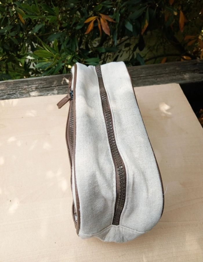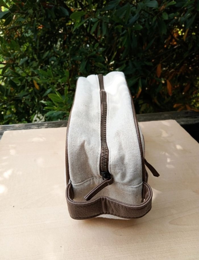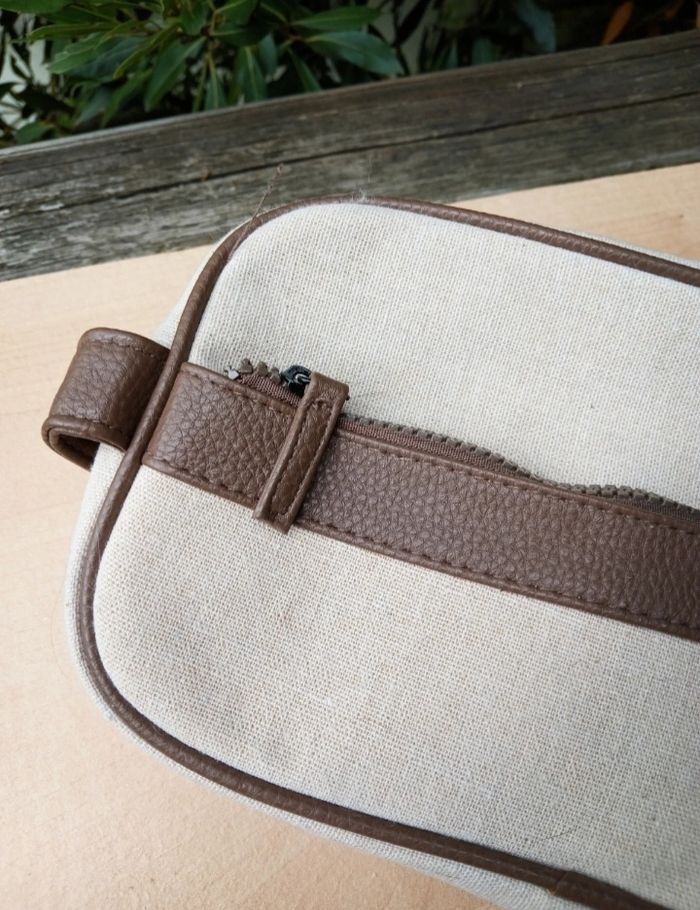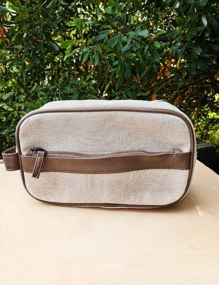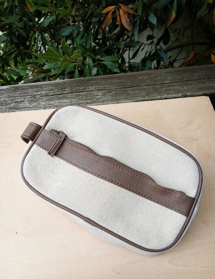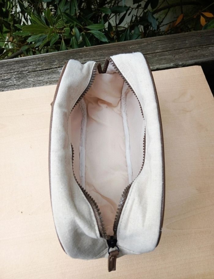 🌟 Article en excellent état, aucune trace d'usure puisqu'elle avait servi uniquement à stocker des disques démaquillants en restant dans l'armoire, donc il n'y aucune odeur de produit d'hygiène, ni de traces de maquillage ou autre 🌟 Forme rectangulaire, fermeture zippée, poignet sur le côté 🌟 Couleur beige clair naturel avec un empiècement en simili cuir marron 🌟 La matière extérieure semble être du lin/coton cependant il n'y a pas l'étiquette de composition à l'intérieur pour l'affirmer