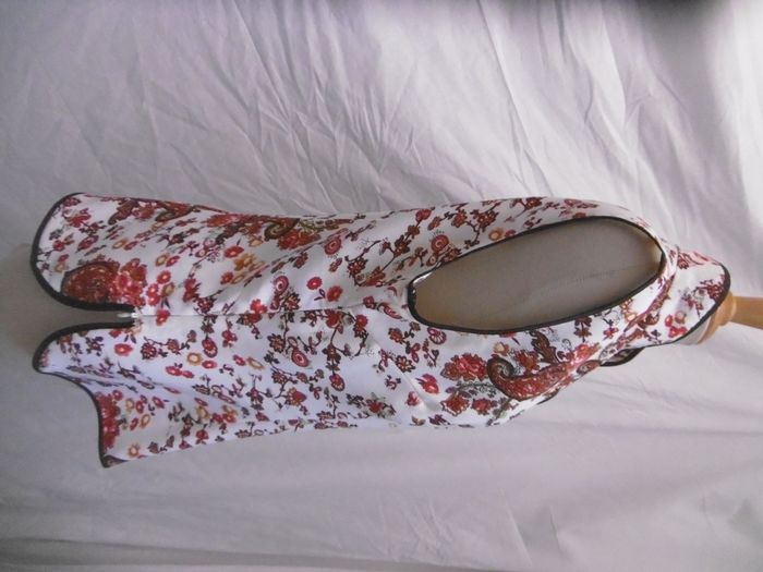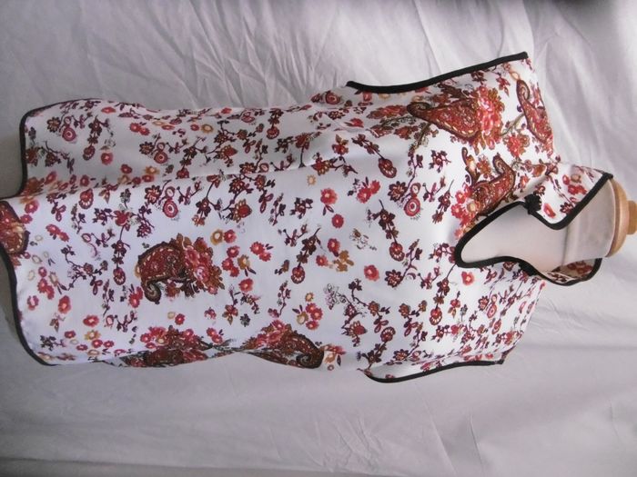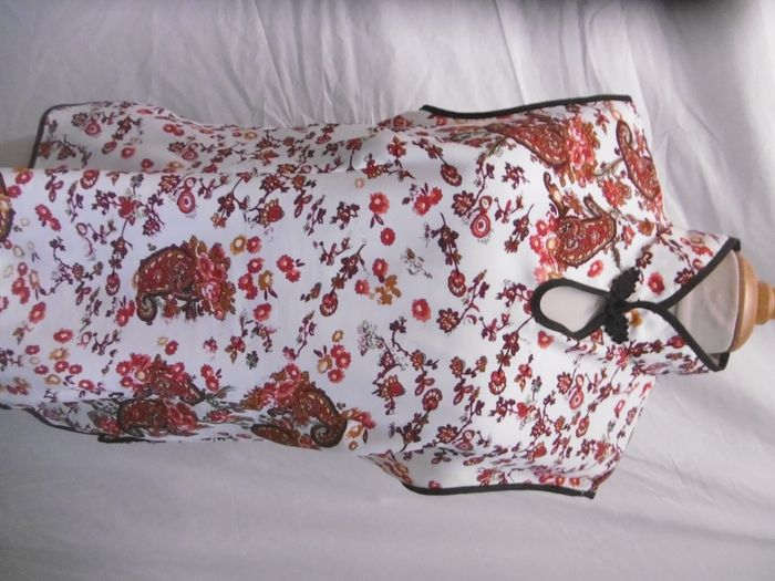 haut top look chinois tissu imprimé sur fond blanc cassé , liseré en pourtour noir , fentes sur les cotés , très bon état d'occasion , légèrement transparent , hauteur=63 cm sous aisselles=50 cm T 40