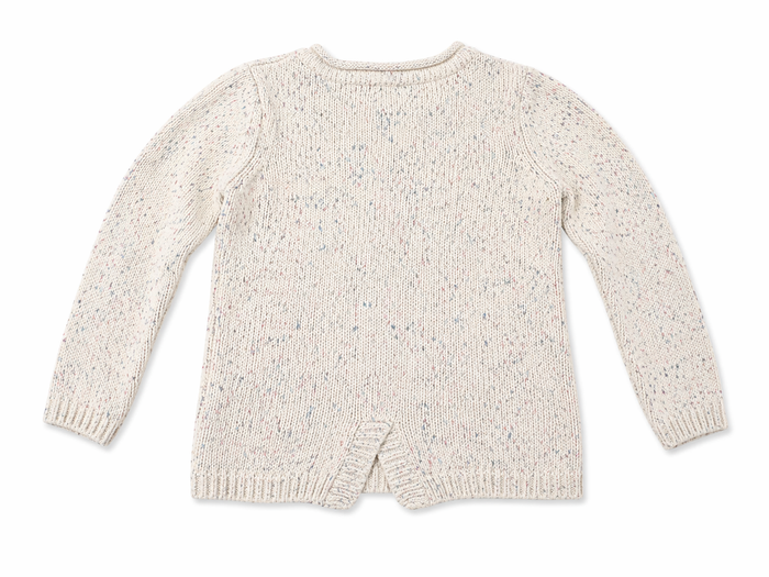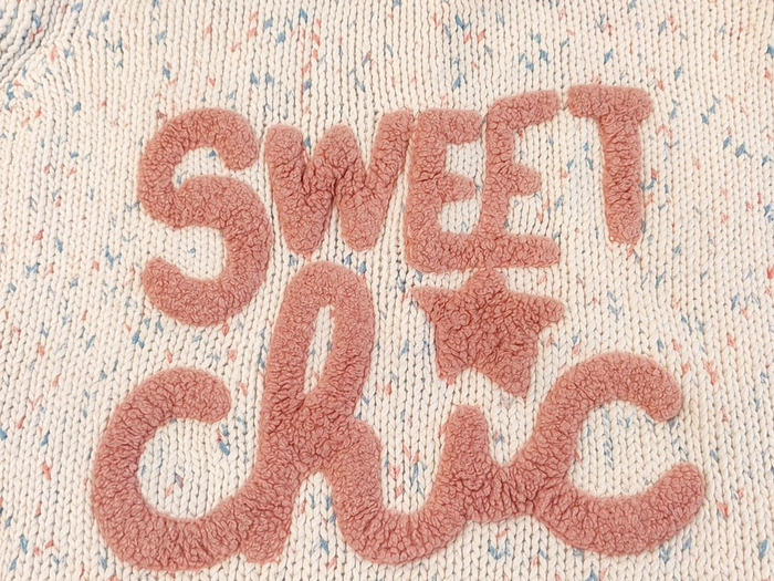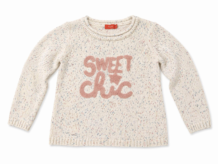 Très joli pull fille, 6 ans. Laine blanche mouchetée aux couleurs pastels, et motif rose en relief. Tissaia. #6ans_nanna33680