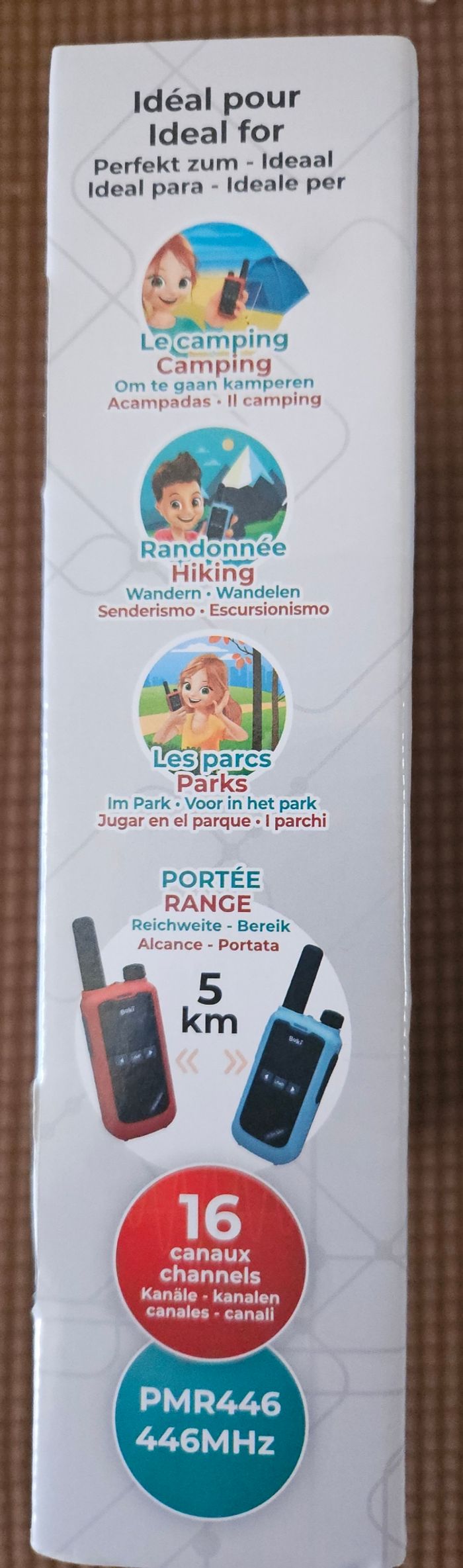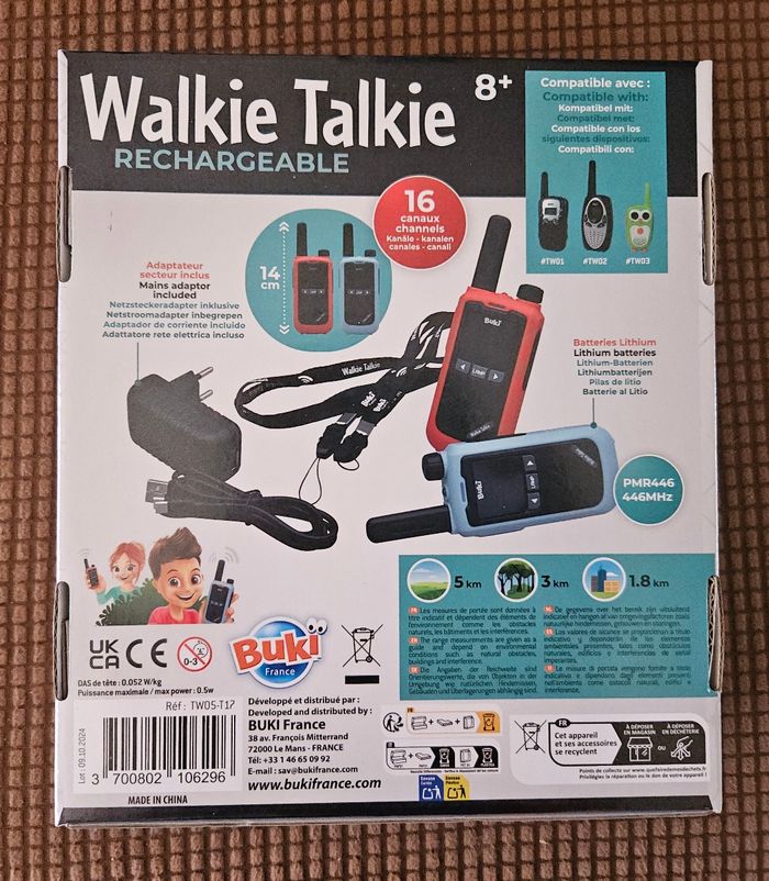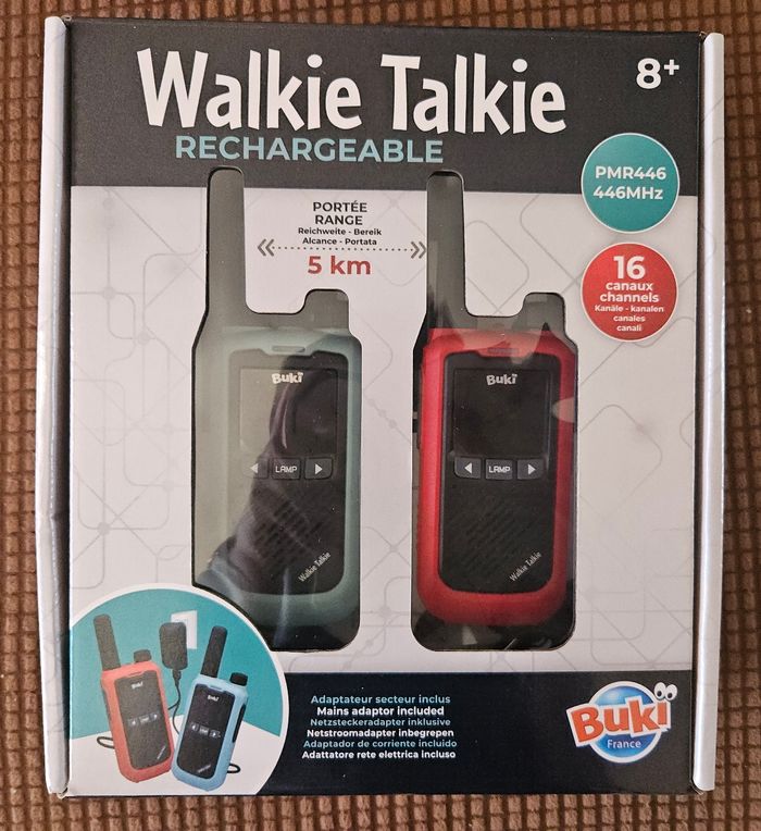 Rechargeables & économiques – Pack de 2 talkies-walkies équipés de batteries Lithium et d’un chargeur double embout, pour des communications sans piles jetables. Longue portée jusqu’à 5 km – Restez connectés même en extérieur grâce à une portée stable idéale pour les balades, randonnées, campings, activités de plein air ou jeux entre enfants. Son clair et puissant – Micros et haut-parleurs améliorés pour des conversations nettes et audibles, même dans les environnements bruyants. 16 canaux & fonctions pratiques – Choisissez parmi 16 canaux utilisables partout, avec lampe intégrée, clip ceinture et autres fonctionnalités pensées pour la sécurité et le confort. Pour enfants et adultes – Faciles à utiliser dès 8 ans, livrés avec une notice illustrée en couleurs. Parfaits pour un cadeau original ou pour rester en contact lors d’activités en famille.