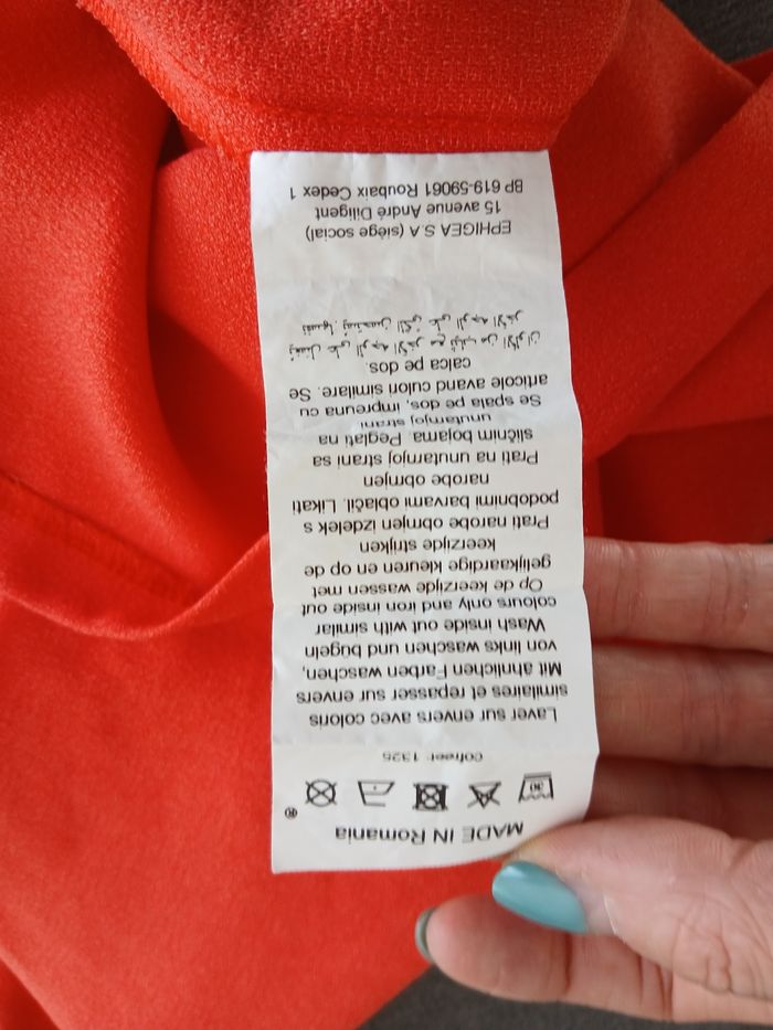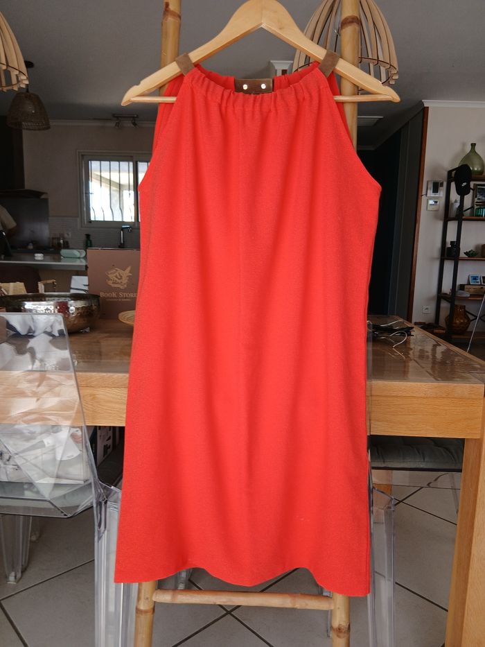 Impeccable. Col amovible genre daim. Au dessus du genou. Longueur 88 cm. Largeur 50 cm. Tissu comme du crêpe,très fluide, agréable à porter. Par contre petit 40..plutôt 38.