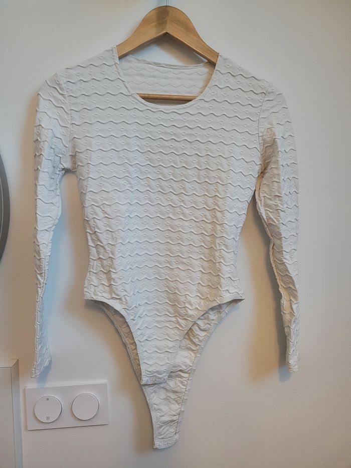 Body blanc manches longues, texturés. Pas transparent. Très bon état. Mesures : Longueur body fermé jusqu'au haut du dos : 65.5cm Longueur body fermé jusqu'au col avant : 57cm Largeur bassin : 33cm Largeur poitrine : 38cm Longueur manches : 53cm Tissu extensible Taille 38/40