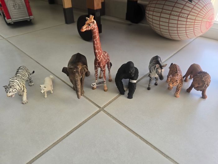 8 figurines Schleich - Tigre Blanc - Renard des neiges - Éléphant - Girafe - Gorille - Zèbre - Lion - Guépard