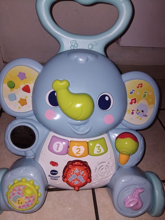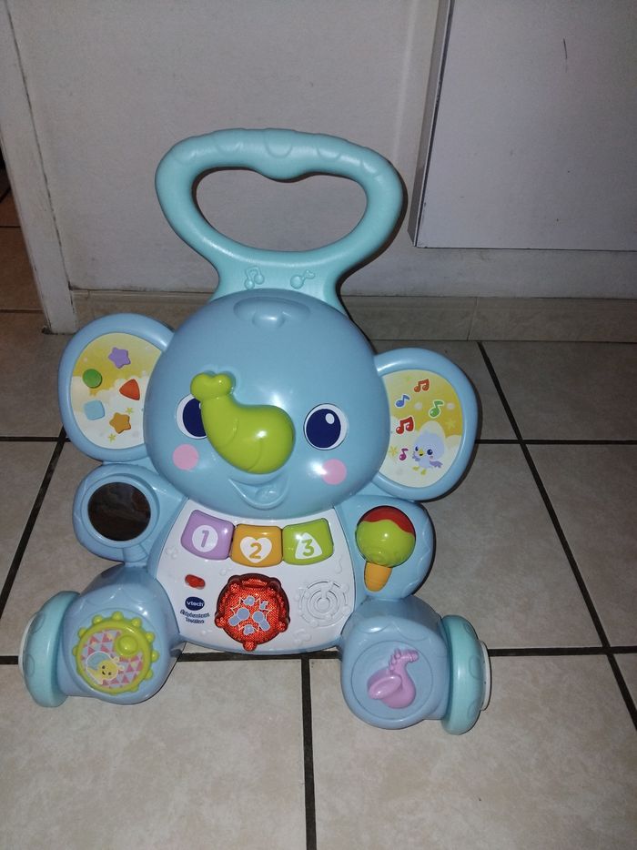 Trotteur bébé marque vtech juste l'électronique qui ne fonctionne pas mise a part ça pas du tout abîmé est en très bonne état les roues on 2 vitesse de roulement et comme on voit sur la photo un emplacement pour ranger des petits jouets