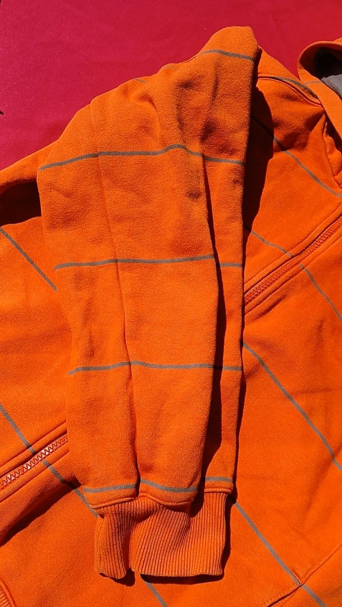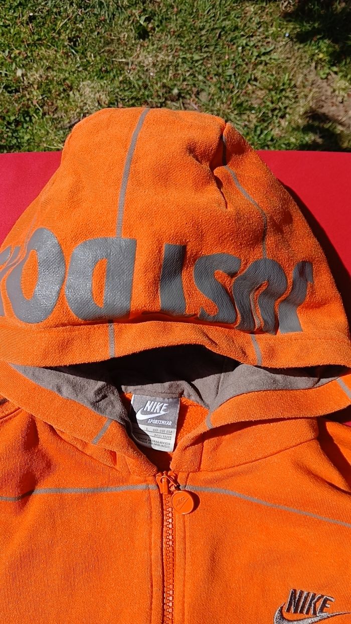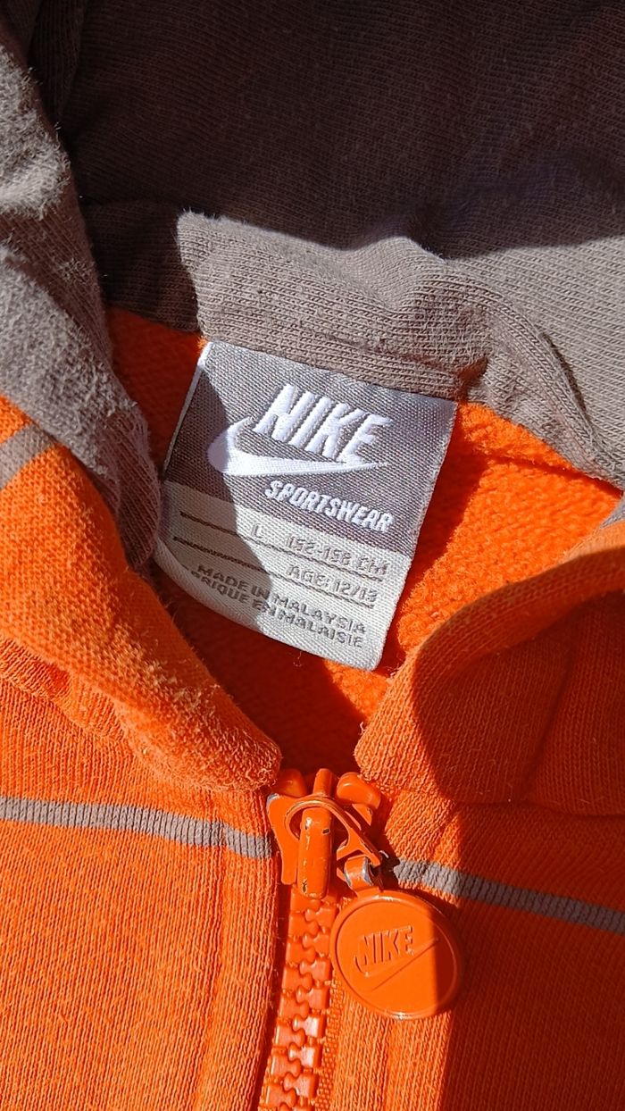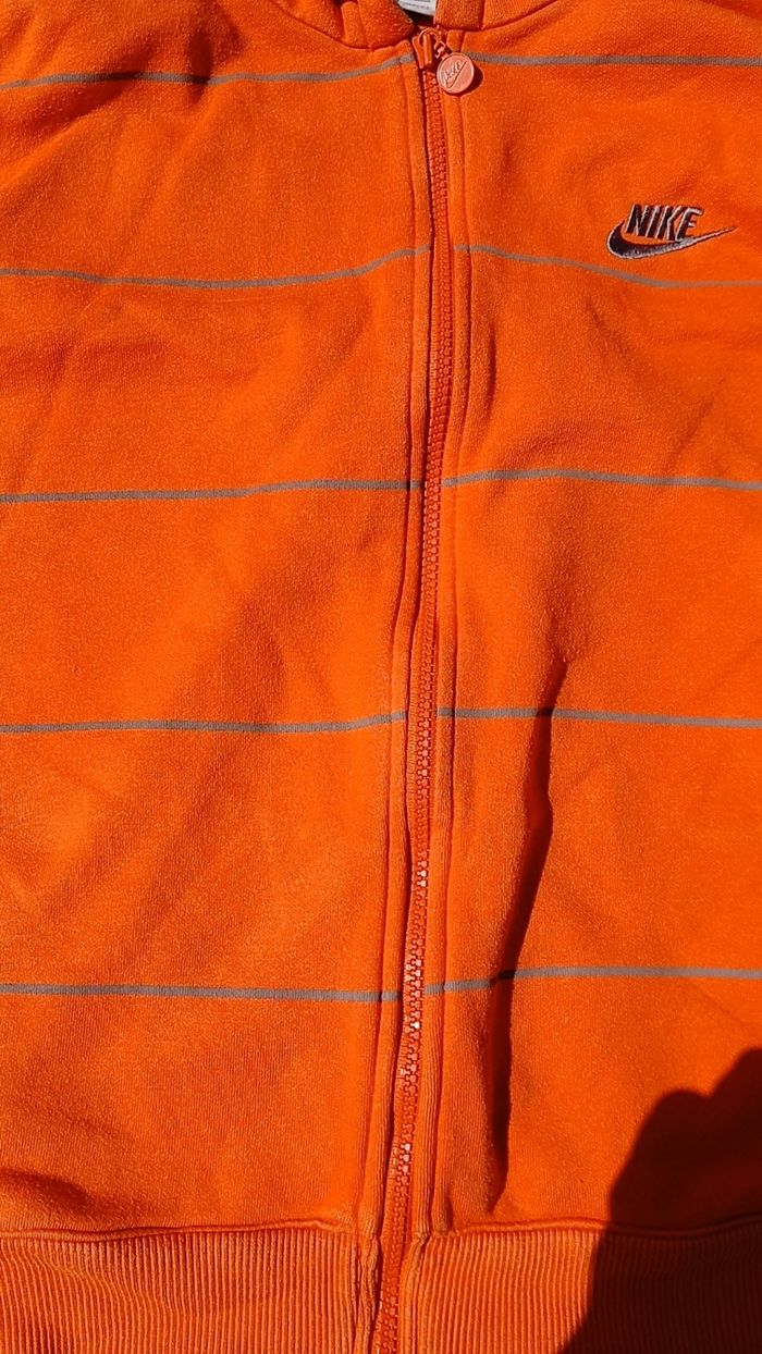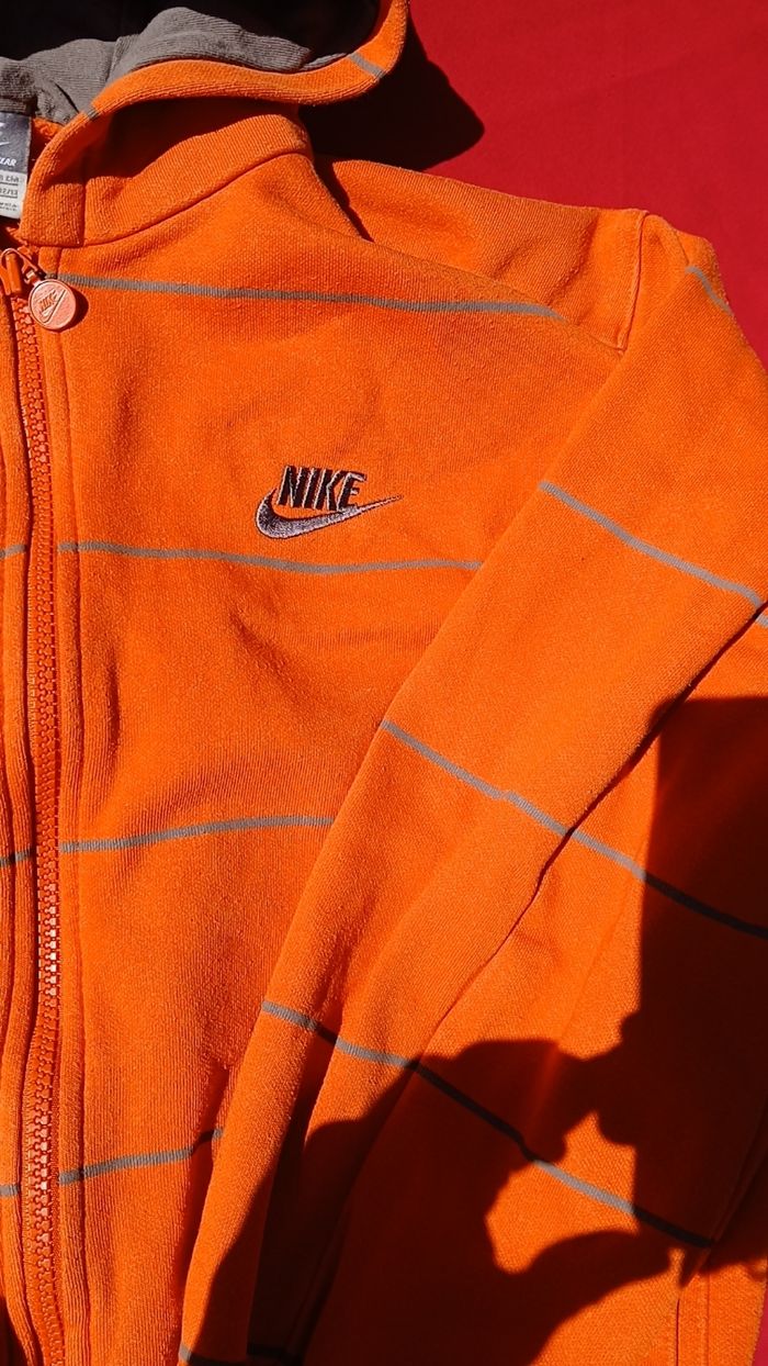 Veste nike, très bon état, couleur orange a rayures portée que deux fois. Taille 12- 13 ans mais taille grand