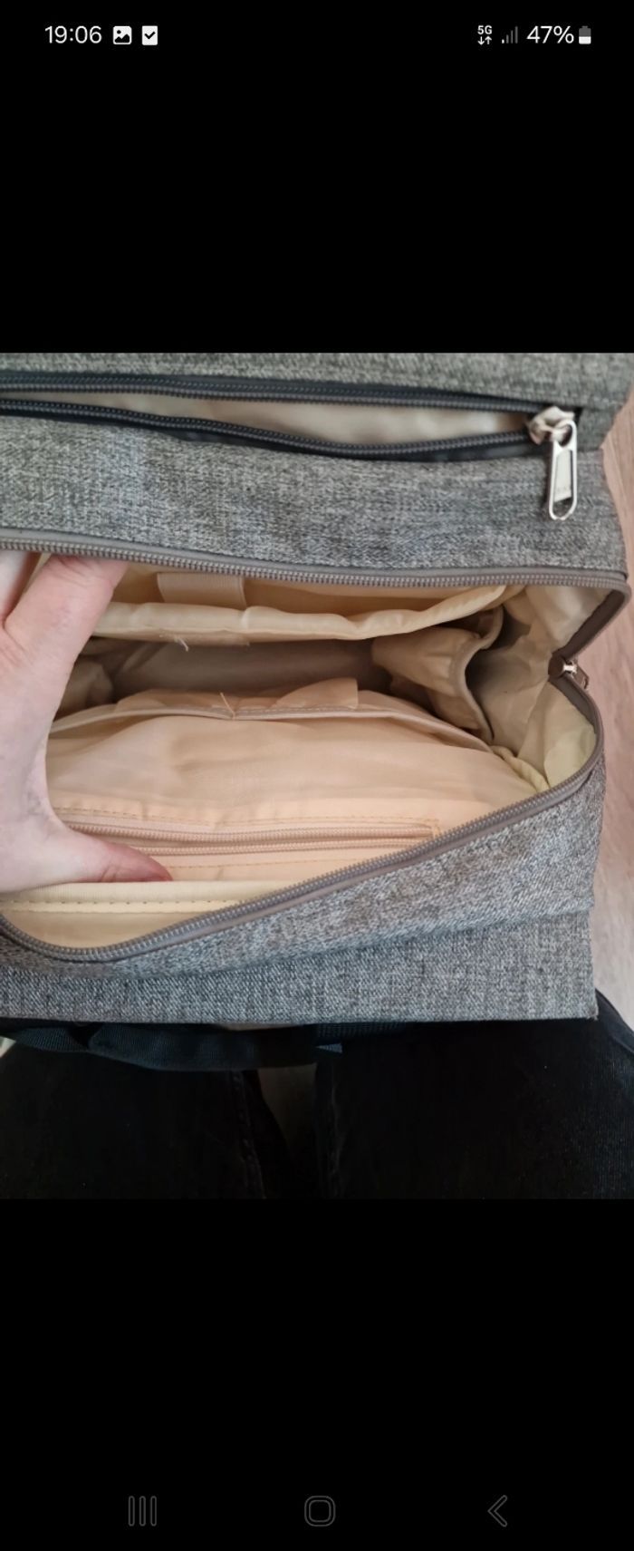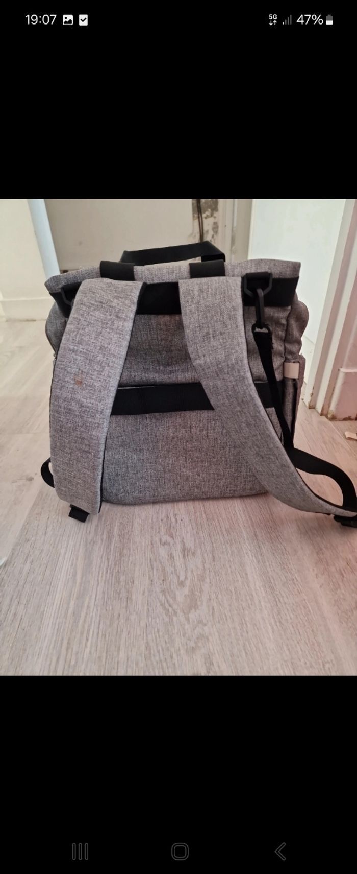 Sac a dos pouvant servir comme sac a langer grace a sa grande capacité de rangements. Plusieurs pochette et espaces, 2 sangles qu'on peu accrocher sur une poussette par exemple. 4 petites pochette isotherme a l'intérieur. En très bon etat a part une petite tache sur une des bretelles (bretelles rembouré confortable Prix fixe
