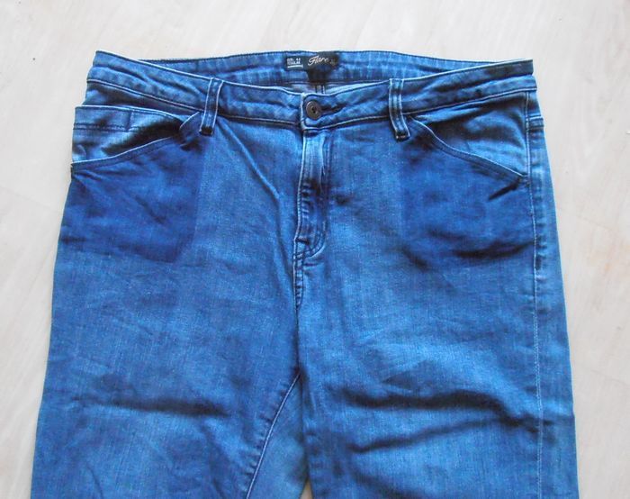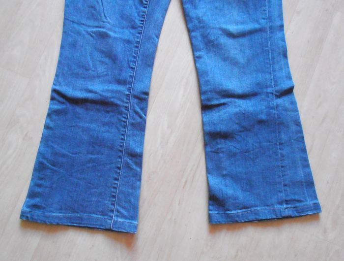 Jeans femme, coupe flare (évasé), marque : Clockhouse, taille XXL/44, couleur bleu, fermeture avec bouton métal et braguette, 3 poches avant, 2 poches arrière, possibilité de passer une ceinture. mesures à plat : largeur 44 cm, longueur 95 cm (femme petite entre 1,55 m/1,60m). Très bon état (légère usure entrejambe). Un jeans féminin et confortable !