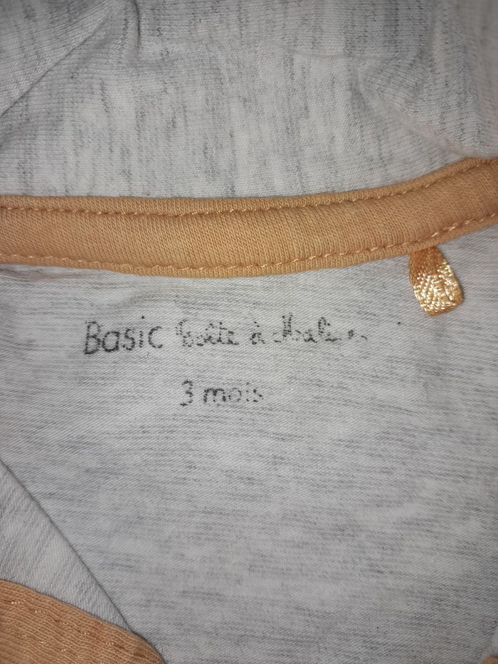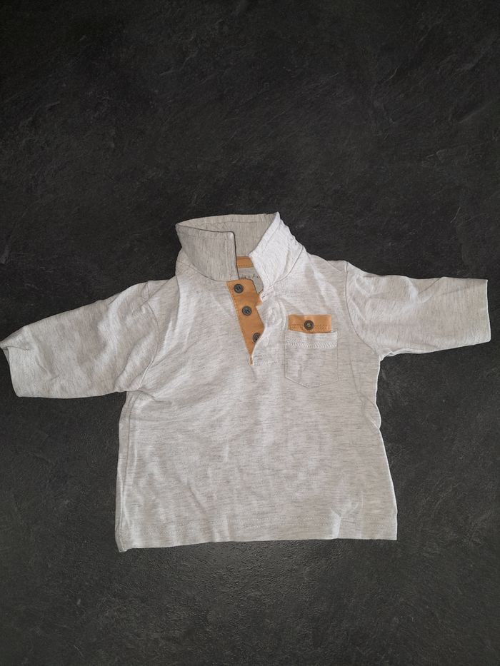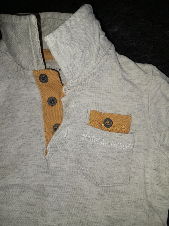 Polo gris et moutarde, à manches longues. Avec boutons et poche devant.